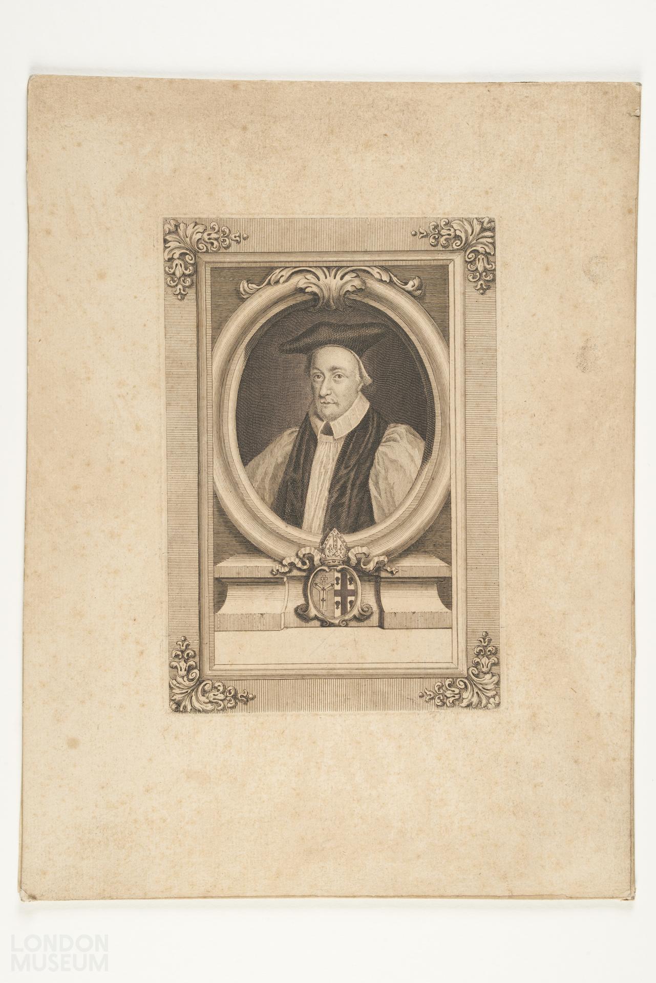 Portrait of Archbishop William Juxon, 1582-1663, with ornate border and coat of arms - see DNB. Engraving by G Vertue?