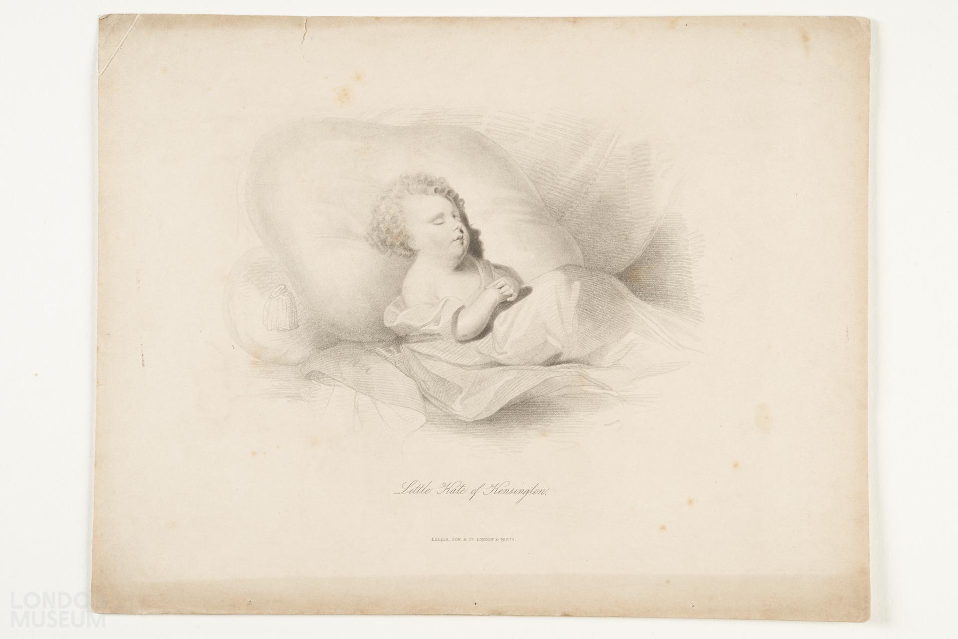 Image of a small child sleeping on a pillow with blanket. Little Kate of Kensington