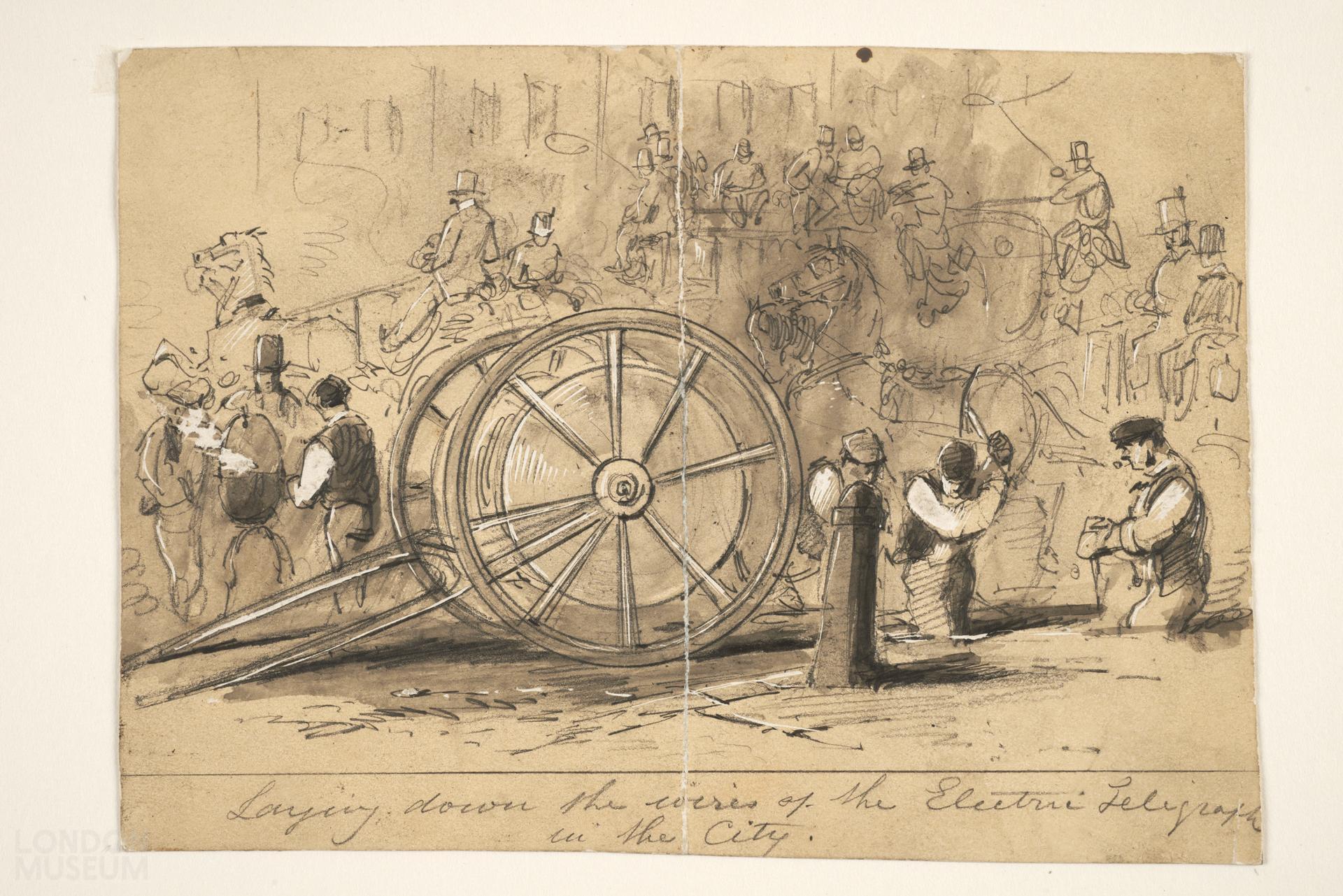 Men dig the street with pickaxes with a large reel of cable nearby. Carriages pass in the background. Brazier on the left. The first electric cable was laid in July 1848 and improvements were made throughout the 1850s. Landells (1833-77) was war correspondent for the ILN covering the Crimean, Prusso-Danish and Franco-Prussian wars.