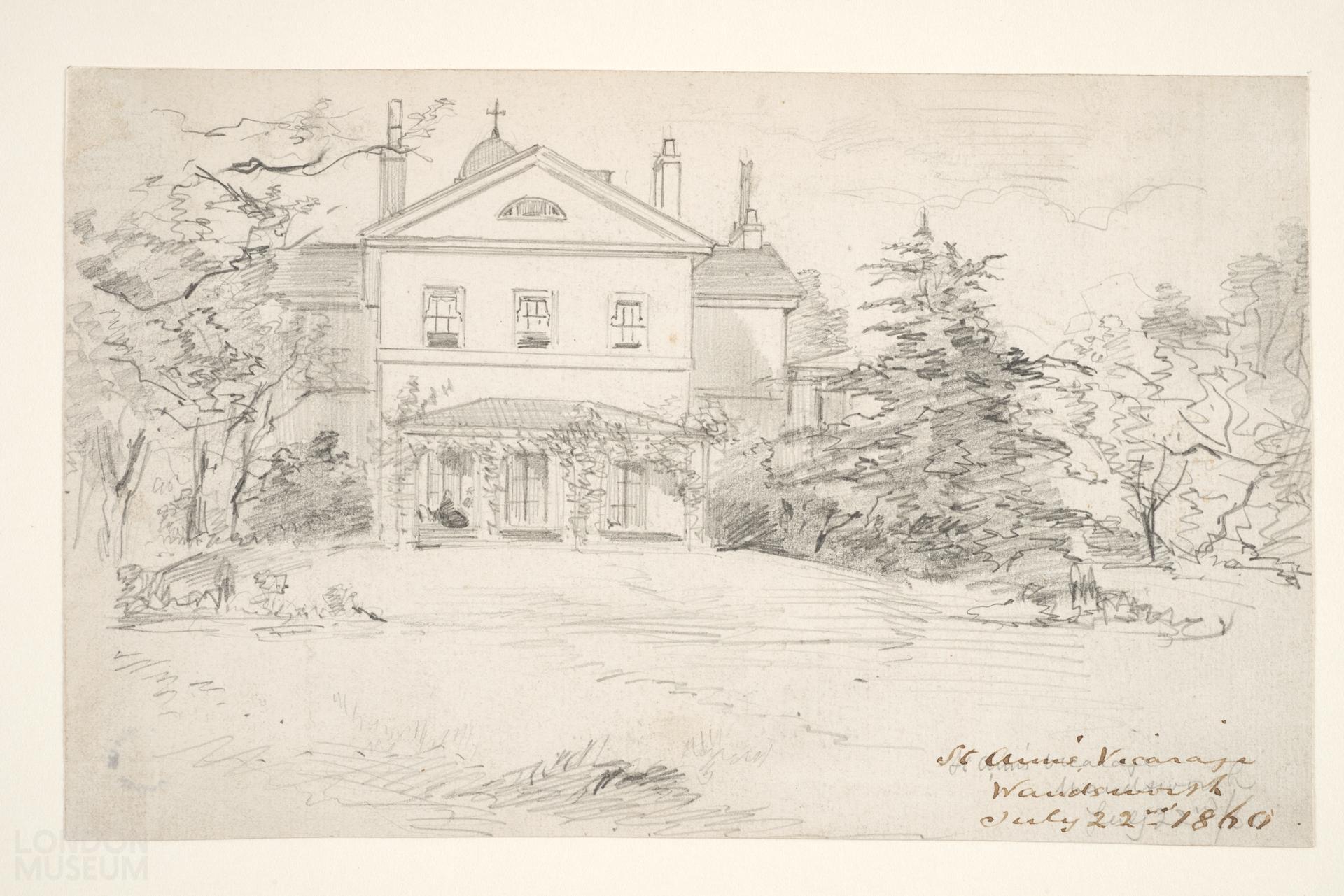 Exterior view of St. Anne's Vicarage Wandsworth, showing the back of the house, veranda & garden. Landells (1833-77) was war correspondent for the ILN covering the Crimean, Prusso-Danish and Franco-Prussian wars.