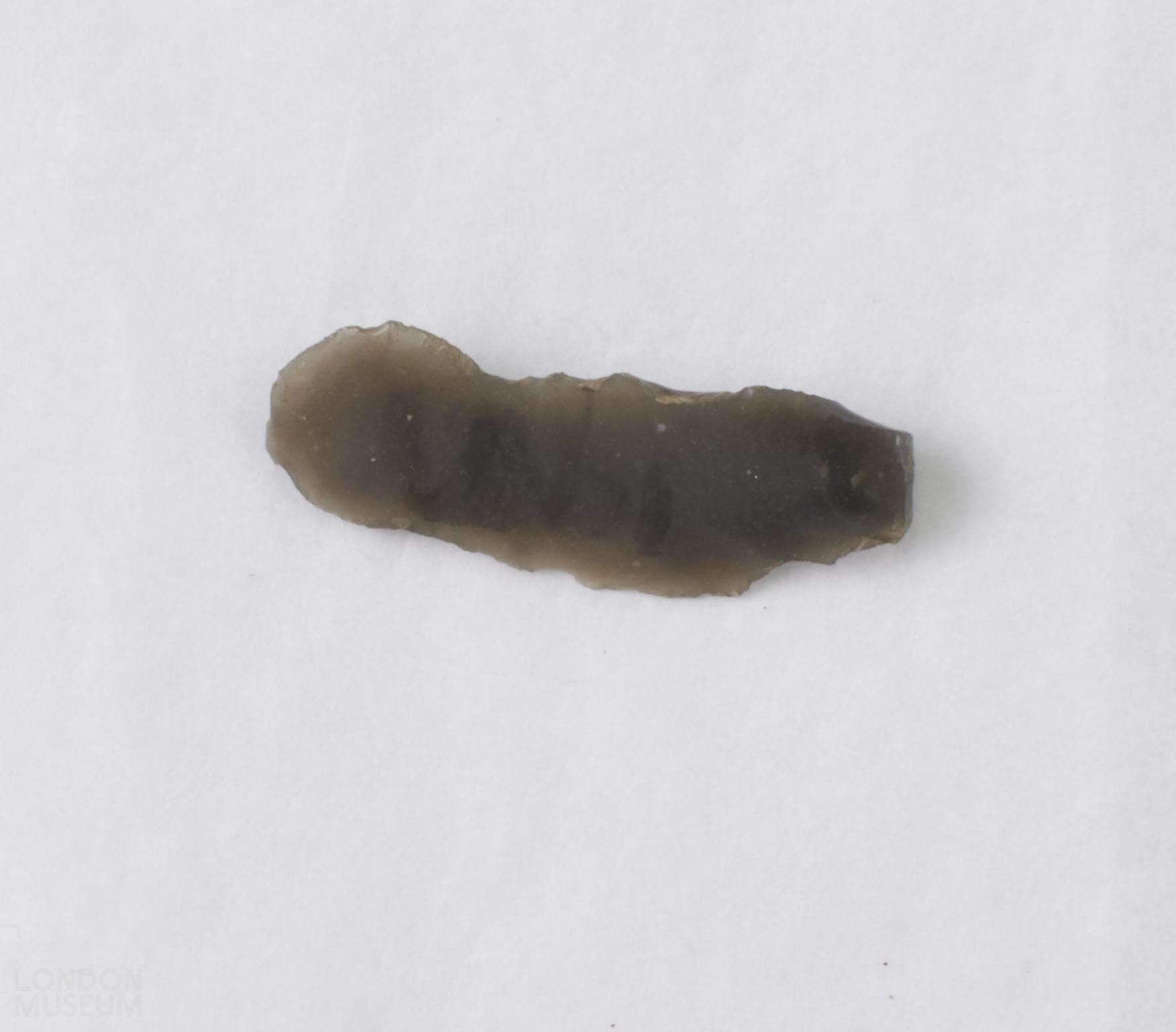 Flint blade, small. Roughly rectangular in shape. Dark grey in colour. Smooth on one side with central ridge on the other side.