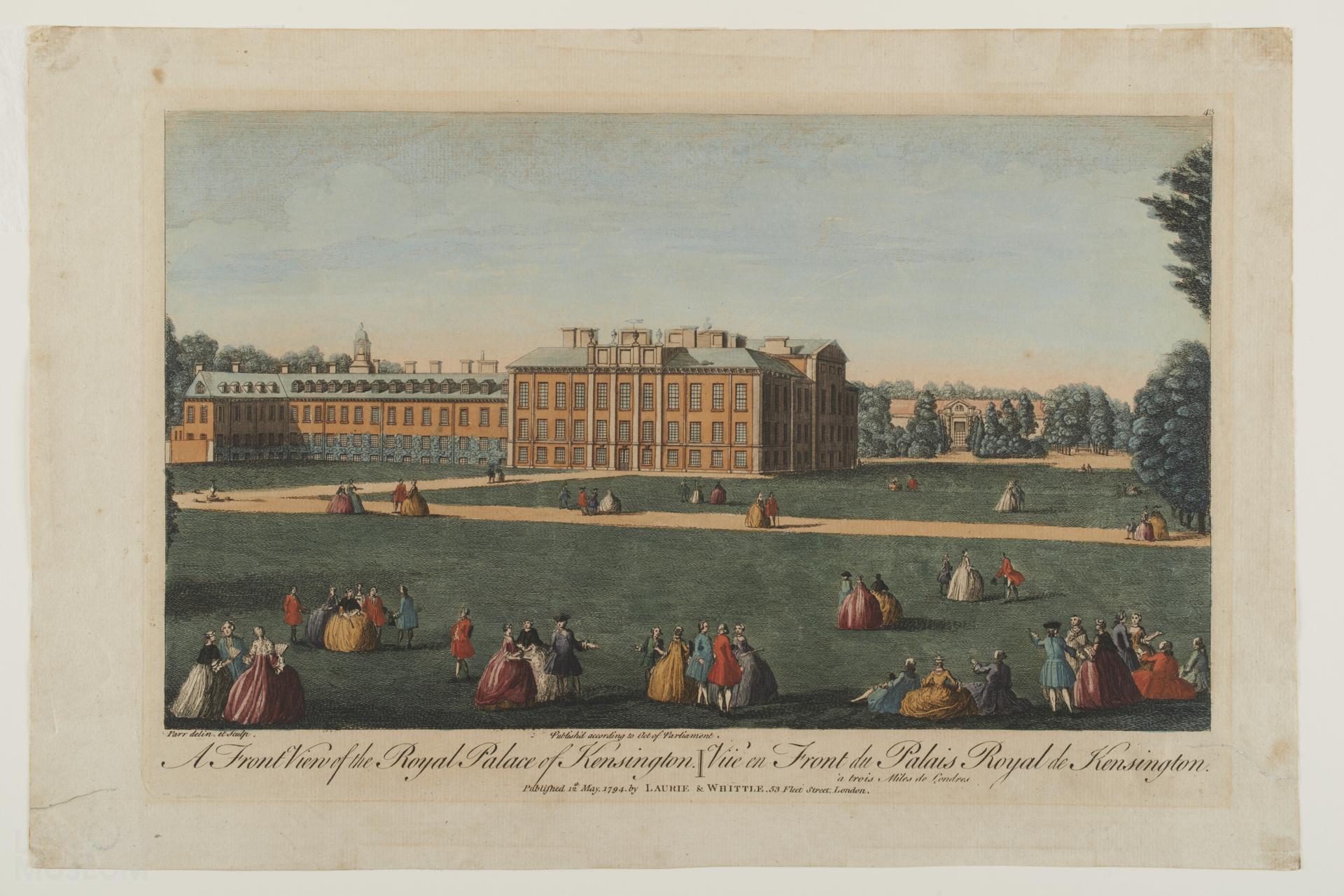 A front view of the Royal Palace Kensington / Vue en front du Palais Royal de Kensington. Kensington Palace from the South. The Orangery is visible on the right in the distance. Elegantly dressed figures are promenading in the Gardens and some are sitting on the grass. This is a re-issue of the print publ. by Robert Sayer in 1751 (See A18077).