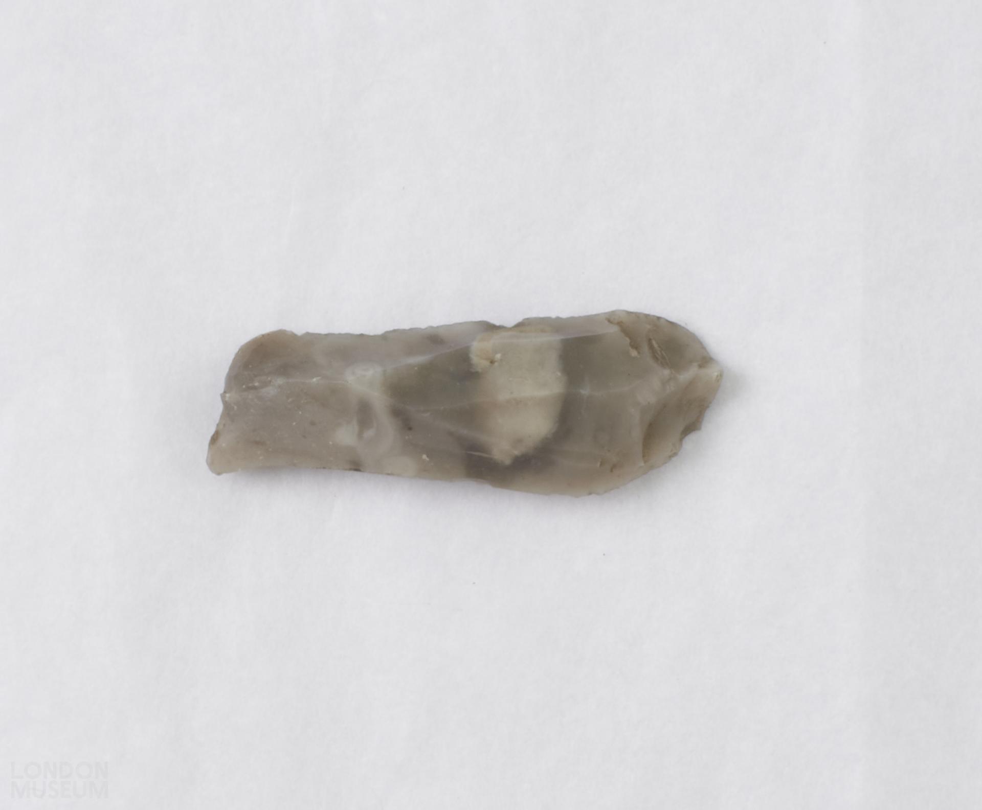 Flint blade, small. Roughly rectangular in shape. One end slightly rounded. Grey in colour. Smooth on one side with central ridge on the other. Slightly curved.