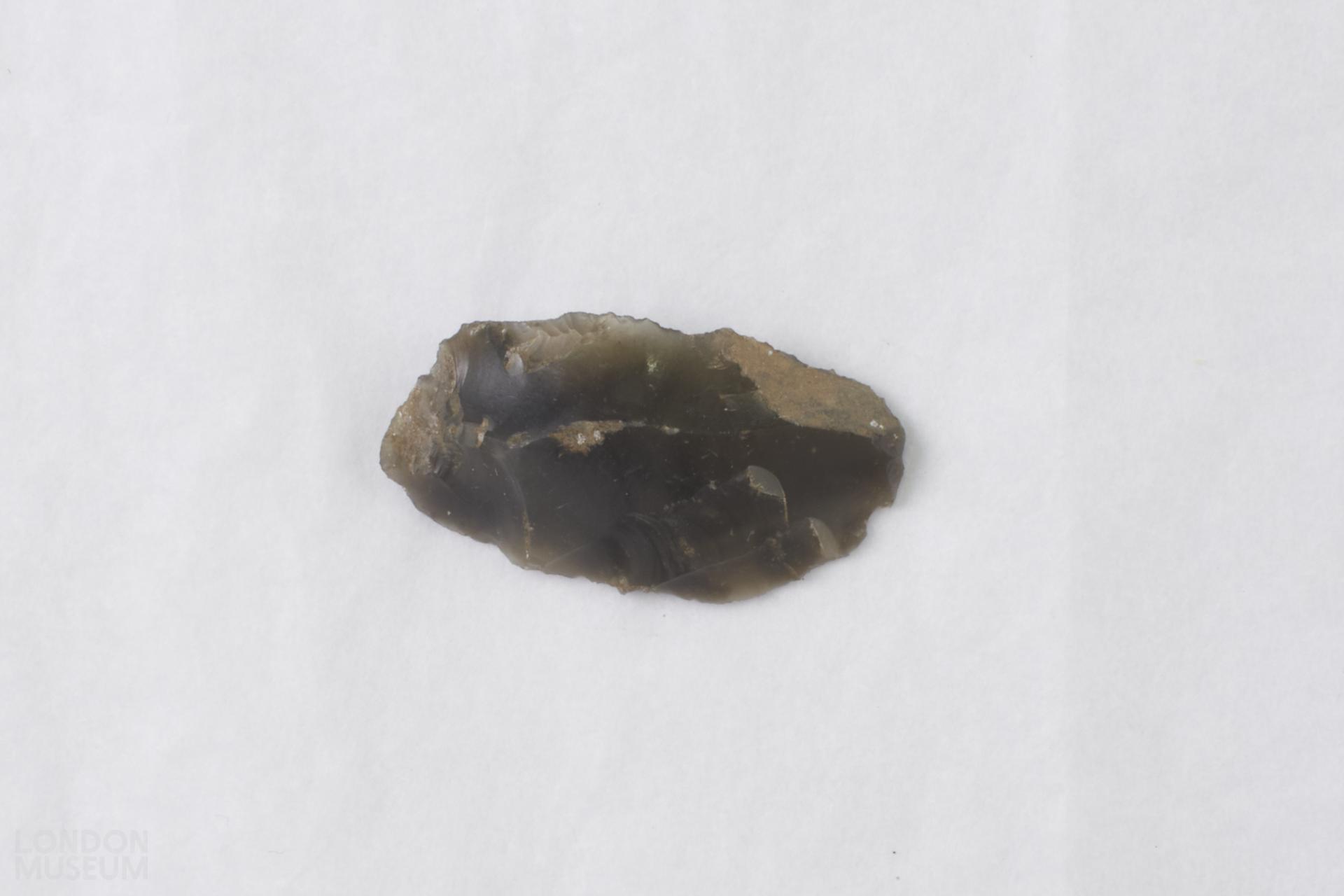 Flint flake. Roughly oval shaped. Dark grey/ black in colour.