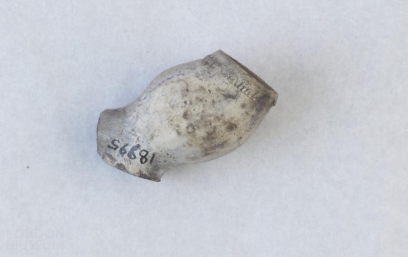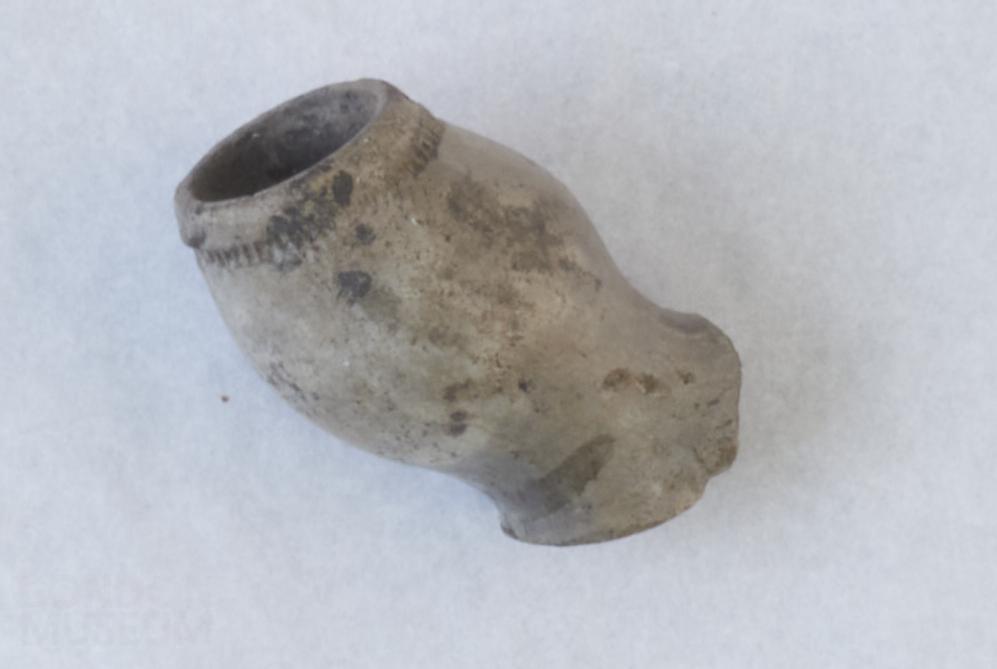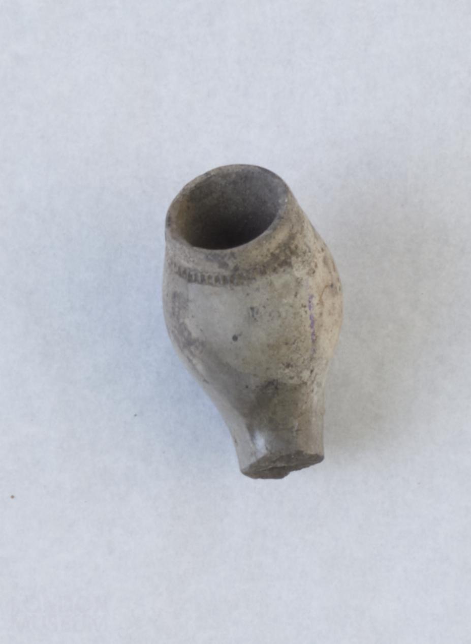 Incomplete grey clay-pipe, only bulb remaining. Foot stamped: S over B C. Type AO5.