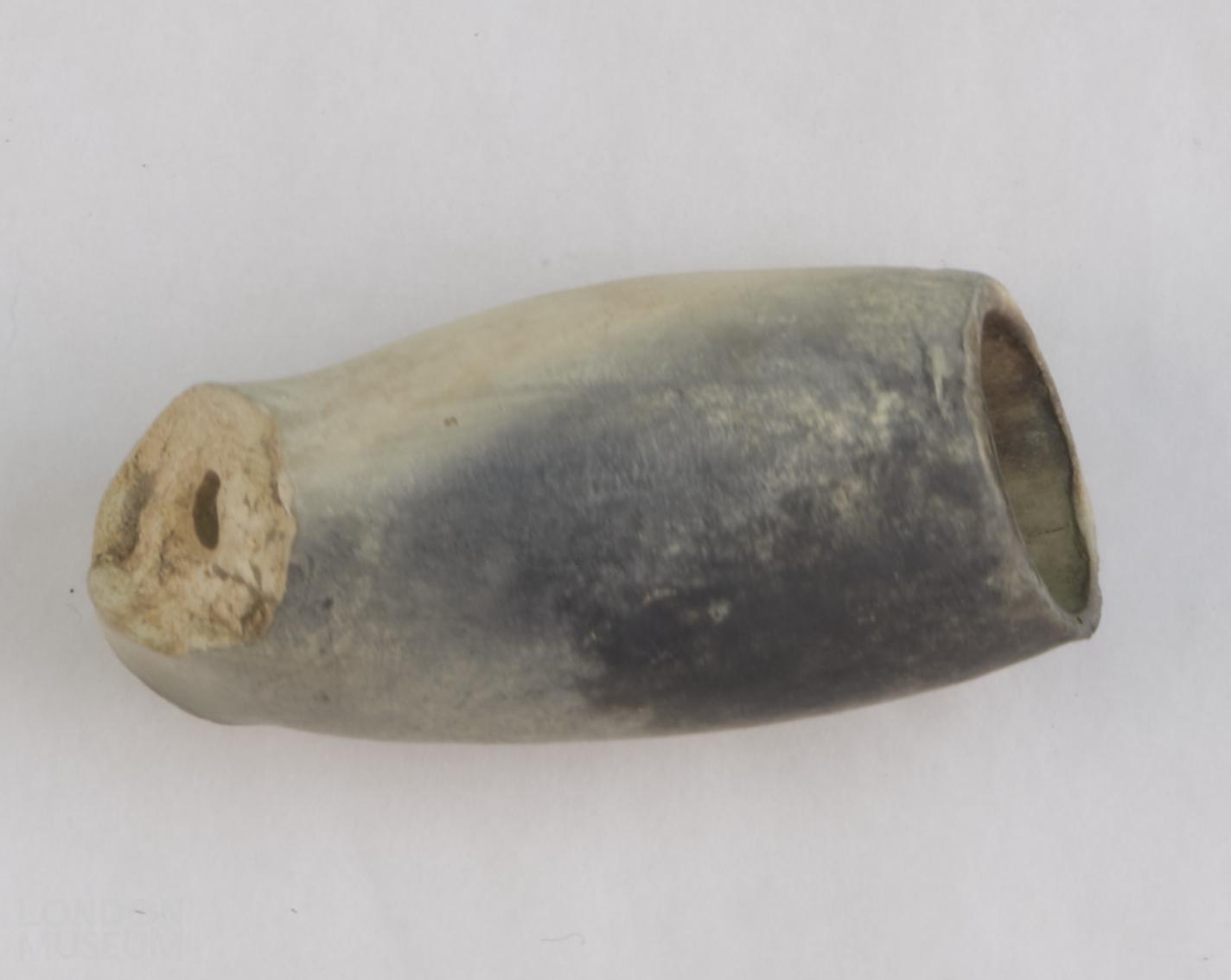 Incomplete white clay pipe, Type AO17. Most of the stem is missing. Black stain on the head.