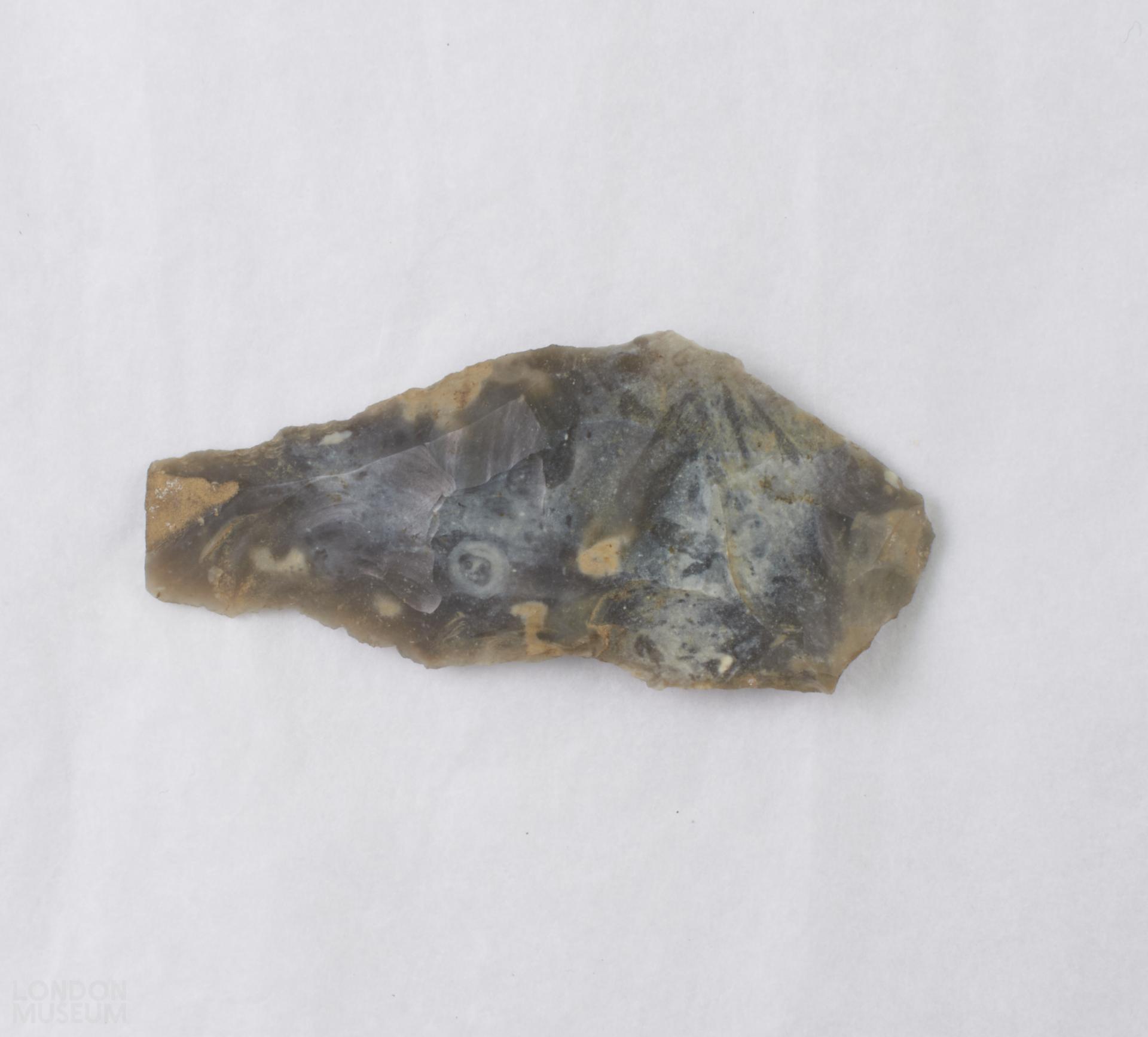 Flint flake from a prepared core. Irregular pentagon in shape. Edges have been slightly retouched.