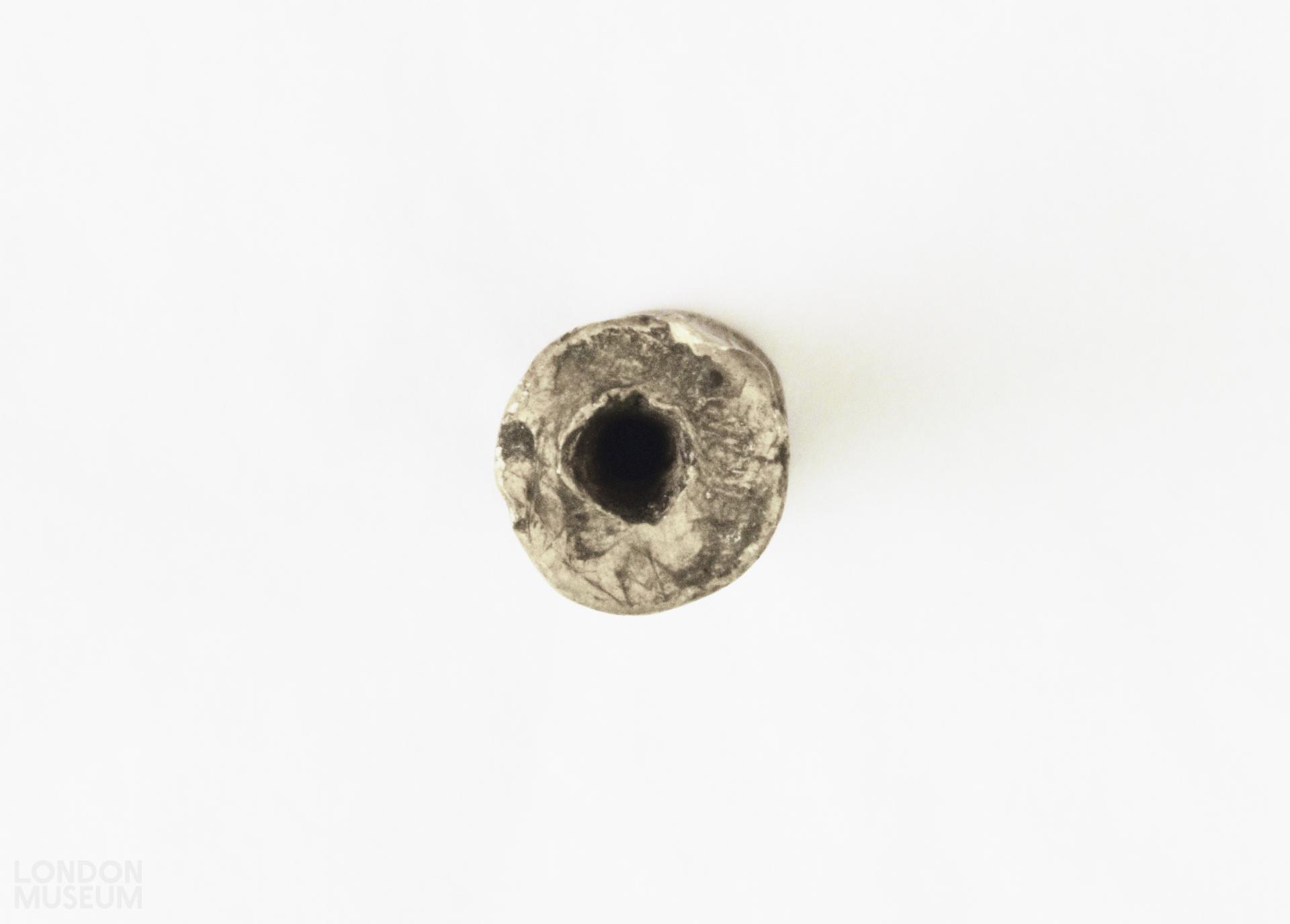 Wig curler with flat ends and hole running through length. Aperture 7mm. Chipped around edges of ends.
