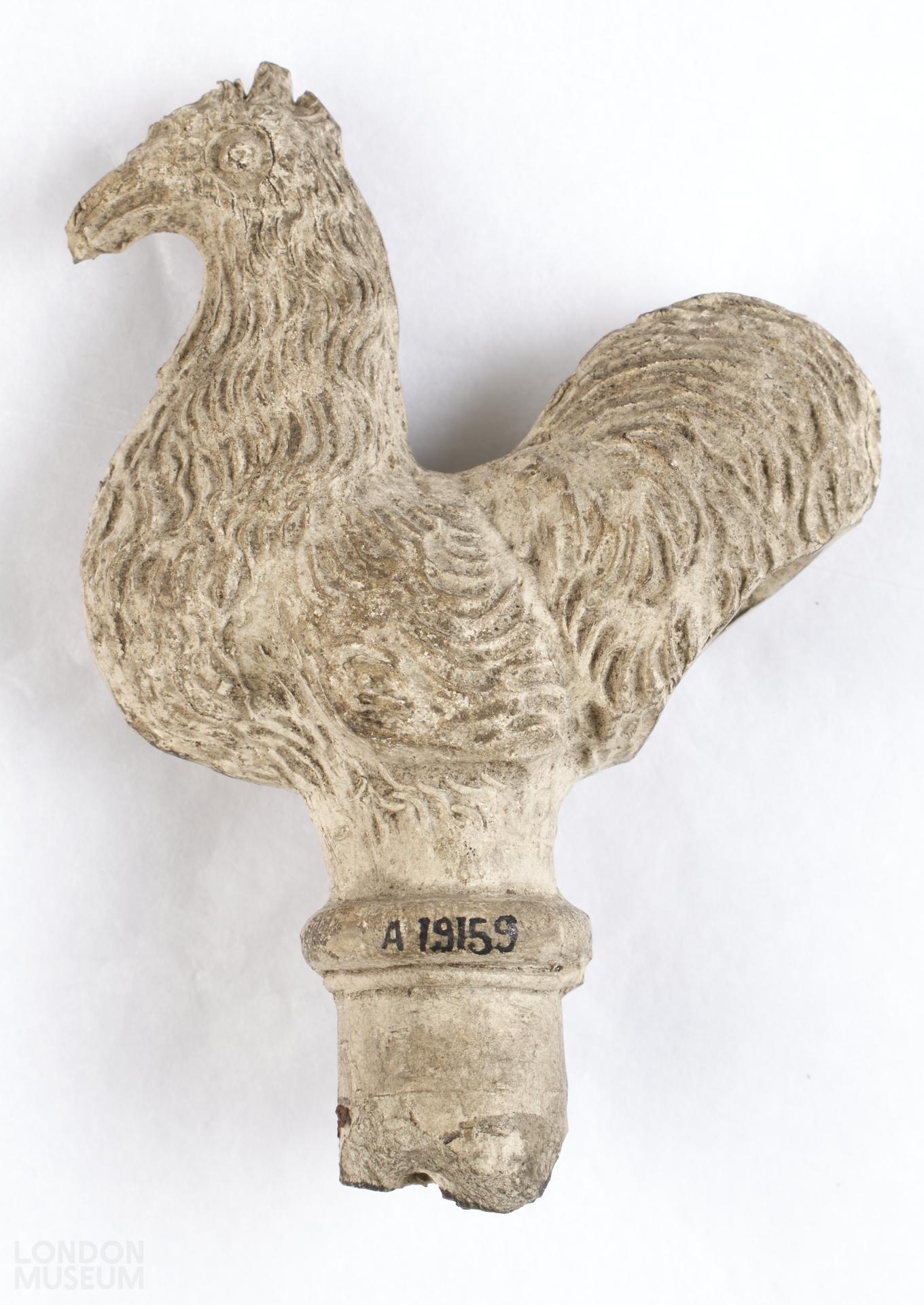 Cockerel on a stand. The figurine may allude to the Denial and Repentance of St Peter, or a representation of Christ as the Man of Sorrows or could be a child's toy and used as a cock shy. There have been a series of this exact inconography (the cockerel on this style of column) also found on a group of tobacco pipes from the Thames.