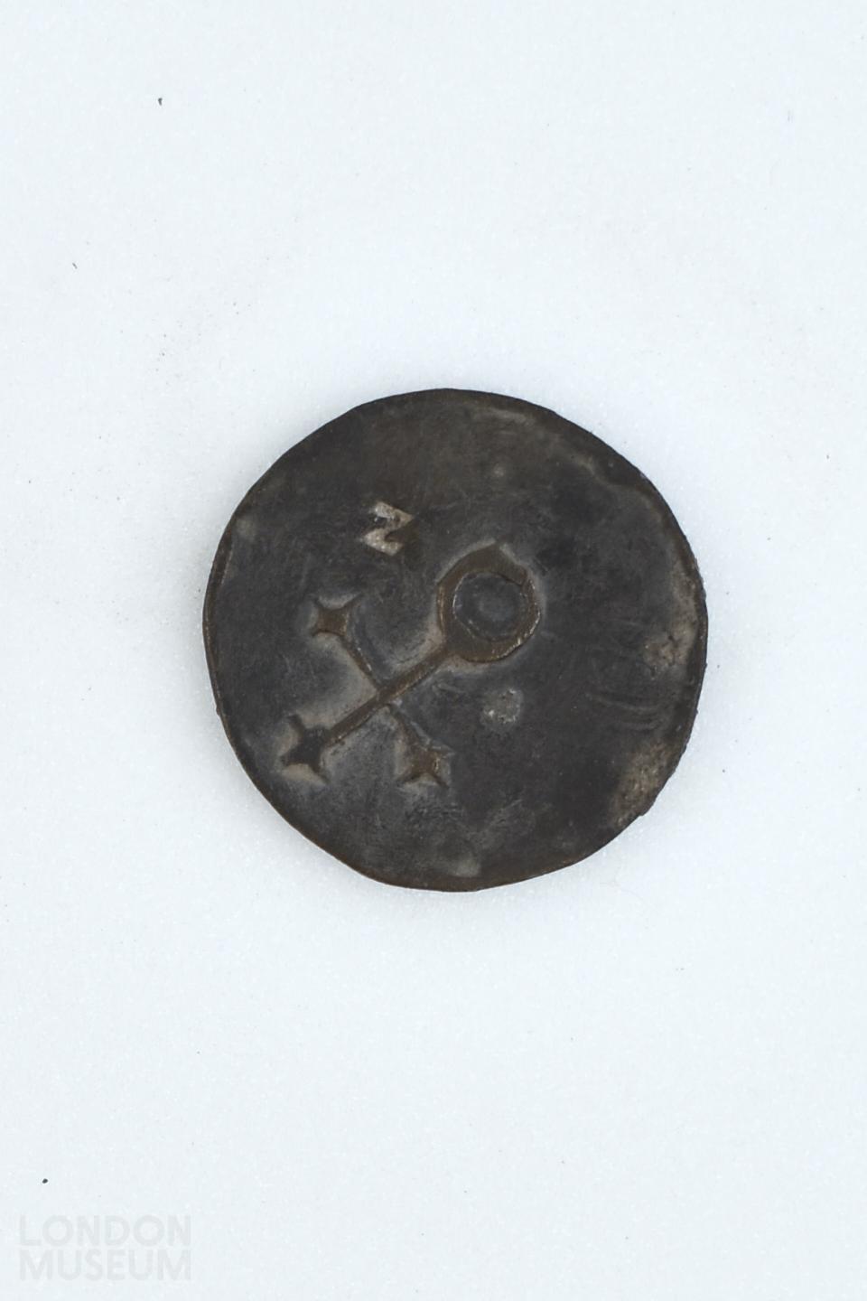 Copper alloy disc weight. Cast with a merchant's mark and stamped with the letter 'Z' on same side. Reverse plain.