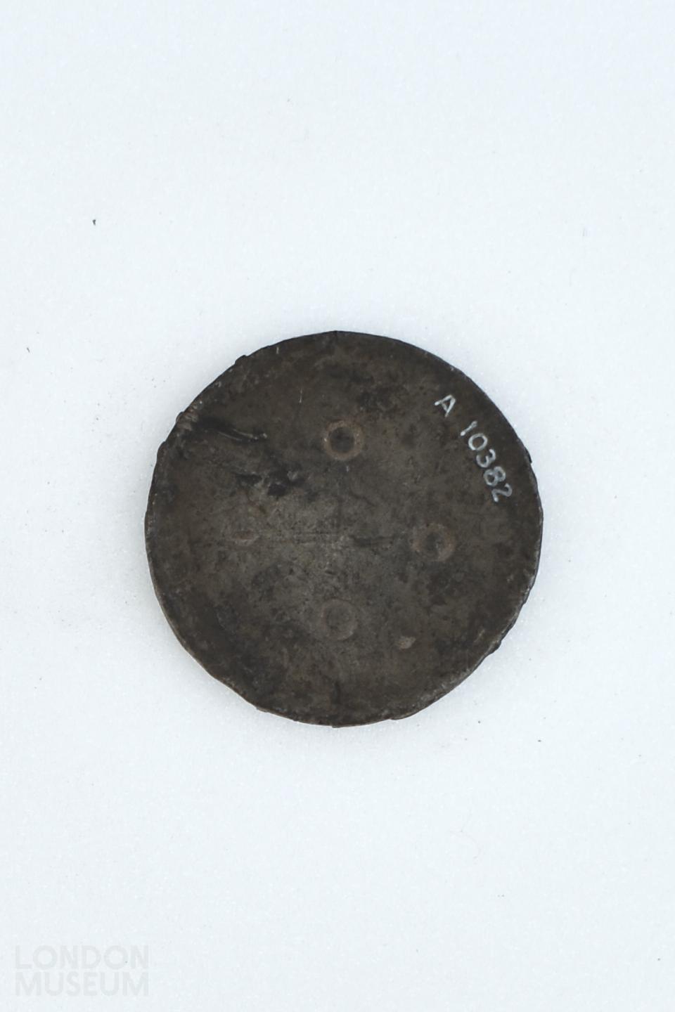 Circular lead alloy weight. 4 stamped circles on one face, with scored cross. Reverse scored. Chipped and worn edge.