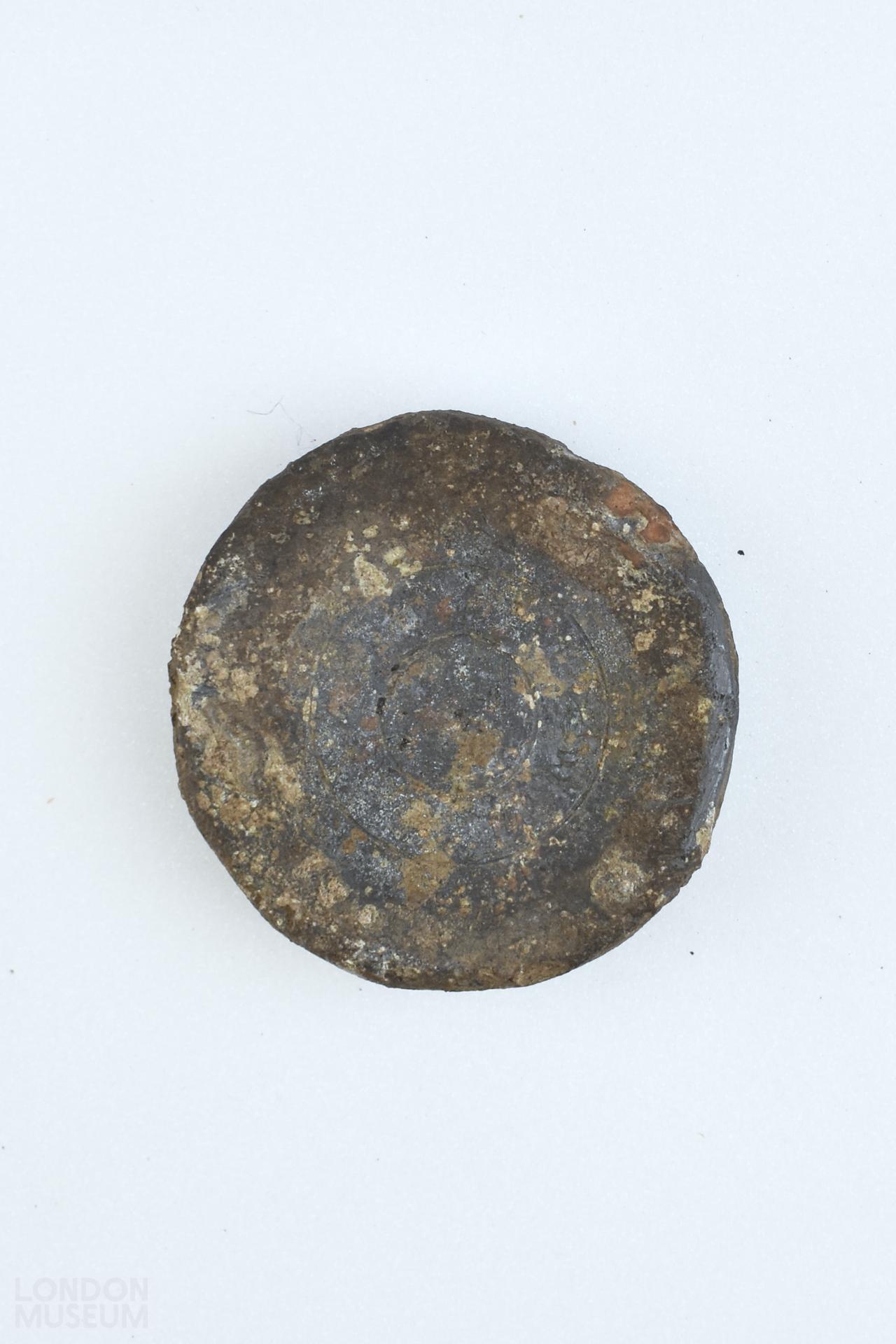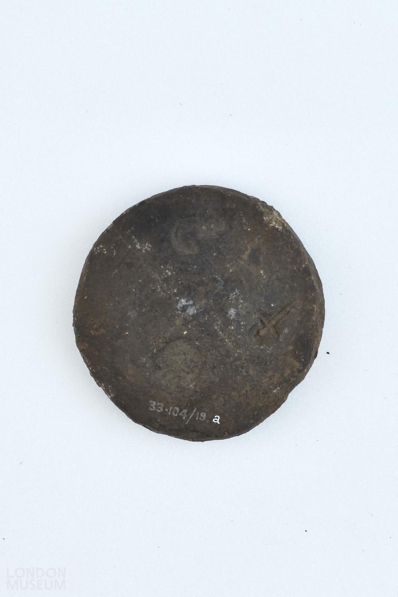 Circular disc weight. Stamped with 3 marks: a dagger for the City of London, an angel with scales for the Plumbers' Company and a third worn mark, possibly a crowned C for Charles I.