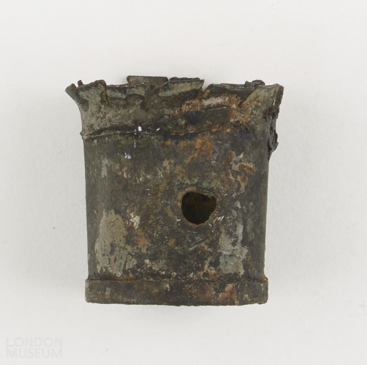 A candle socket which is slightly buckled. It has a pronounced overhanging seem. It has a thicker band of metal around the lower edge. The top edge has been cut and the pieces splayed out. There are 2 holes approximately half way down on either side.