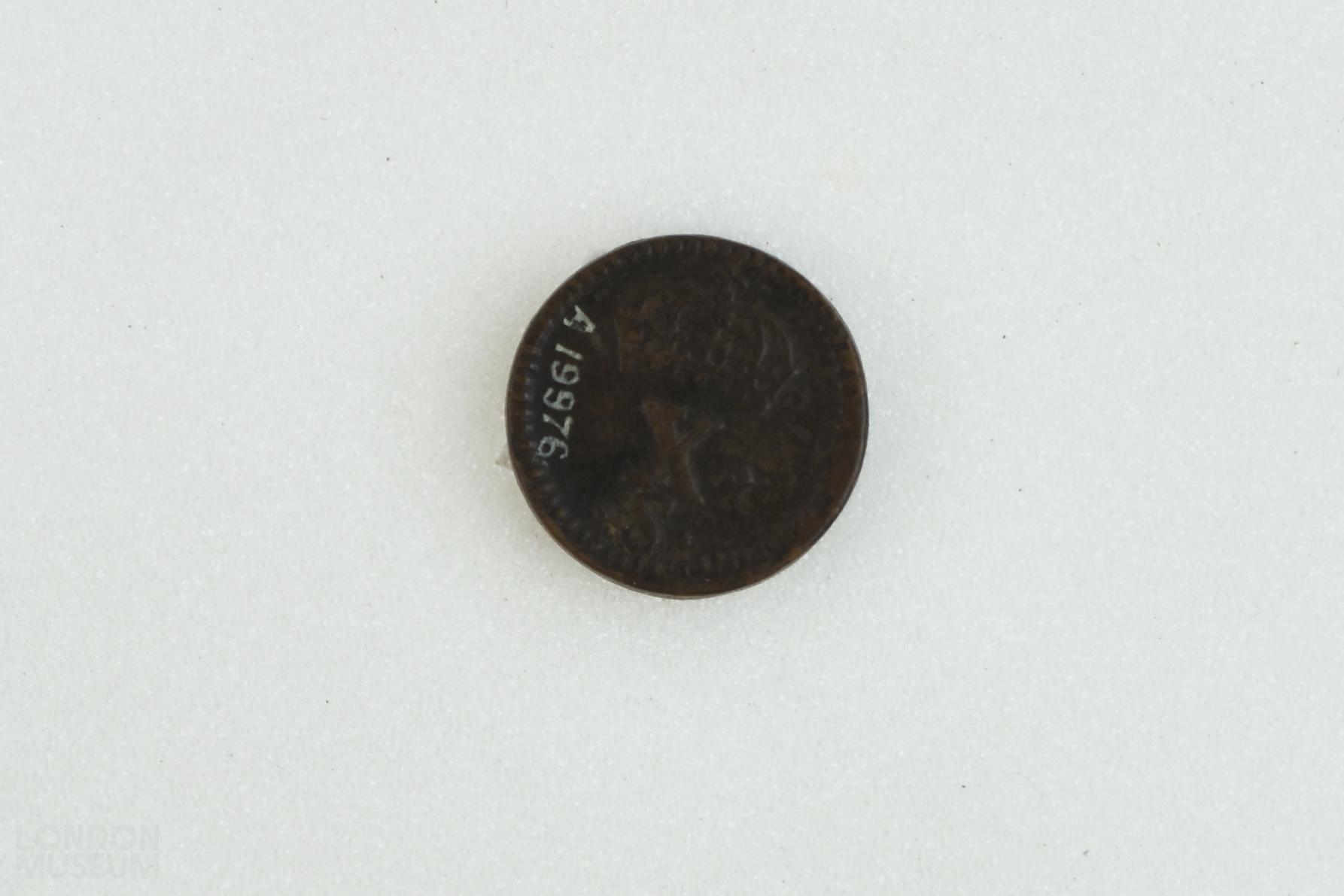 Circular 10/- coin weight of Charles I. The obverse has the head of Charles facing left with the legend 'CAROLVS REX'. The reverse is stamped with a two arched crown above X S.