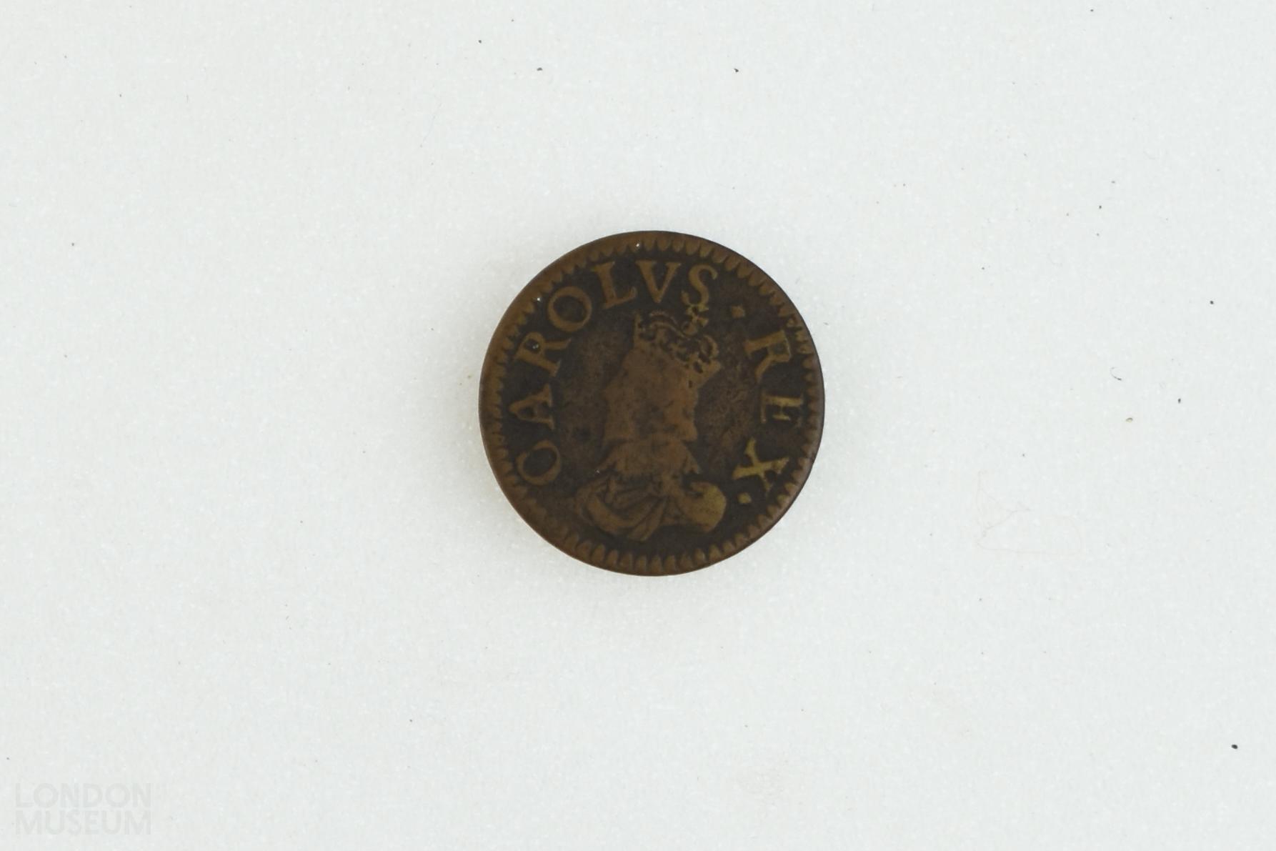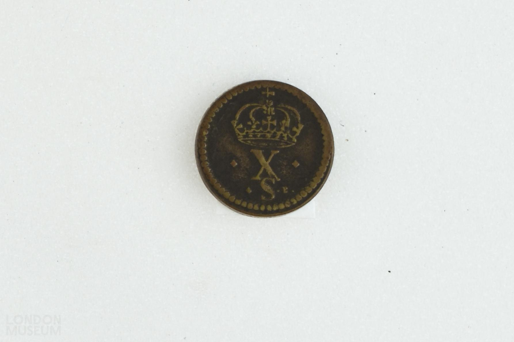 Circular 10/- coin weight of Charles I. The obverse is stamped with the head of Charles facing left with the legend 'CAROLVS REX'. The reverse is stamped with a two arched crown above 'X S'.