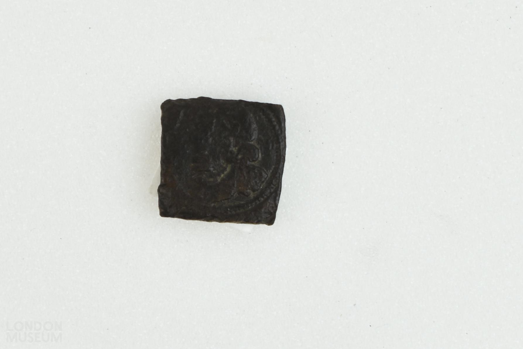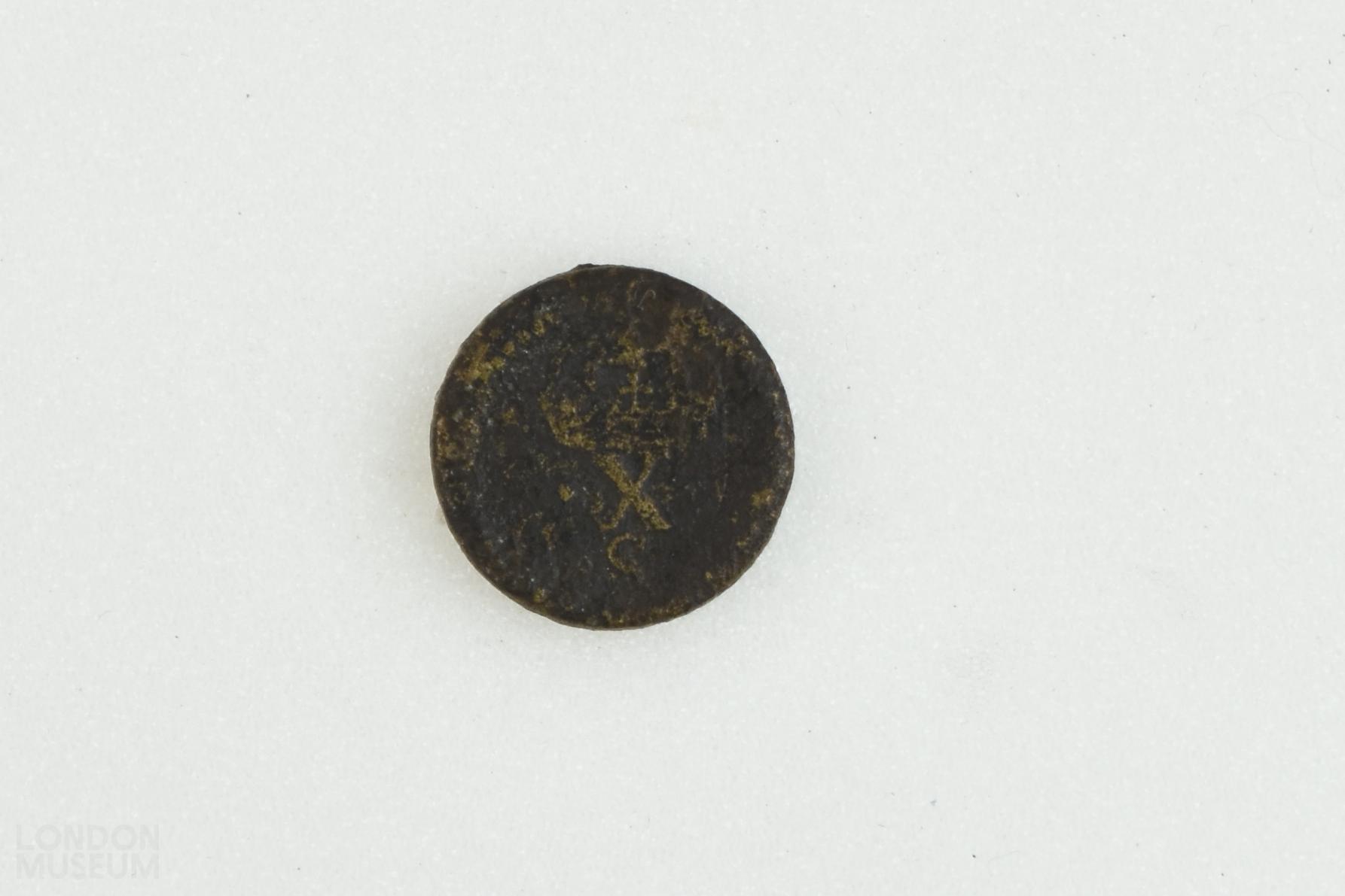 Circular half sovereign coin weight of Charles I. The obverse is stamped with a worn head of Charles I, l, legend indistinct. The reverse is stamped with a worn two arched crown above 'X S'.
