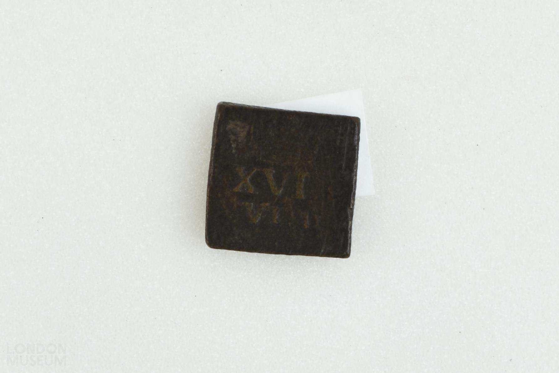 Square coin weight of James I. The obverse is stamped with a Tudor rose within a sunburst with alternating lions and roses around it. The reverse is stamped with an open crown above 'XVI.s VLSD'.