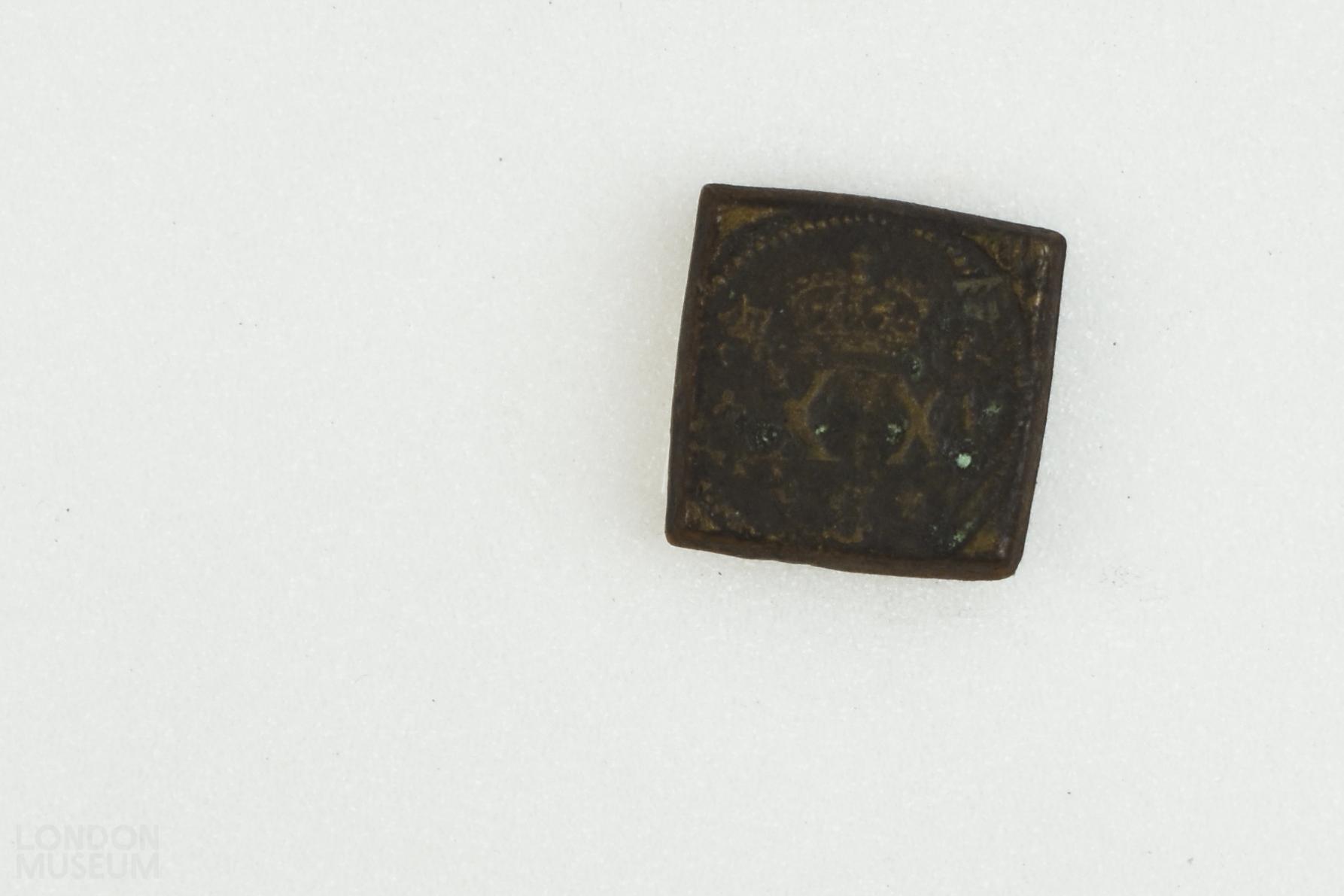 Square coin weight of Charles I. The obverse is stamped with head of Charles facing left with the legend 'REX CARO'. The reverse is stamped with a two arched crown above 'XIX S'.