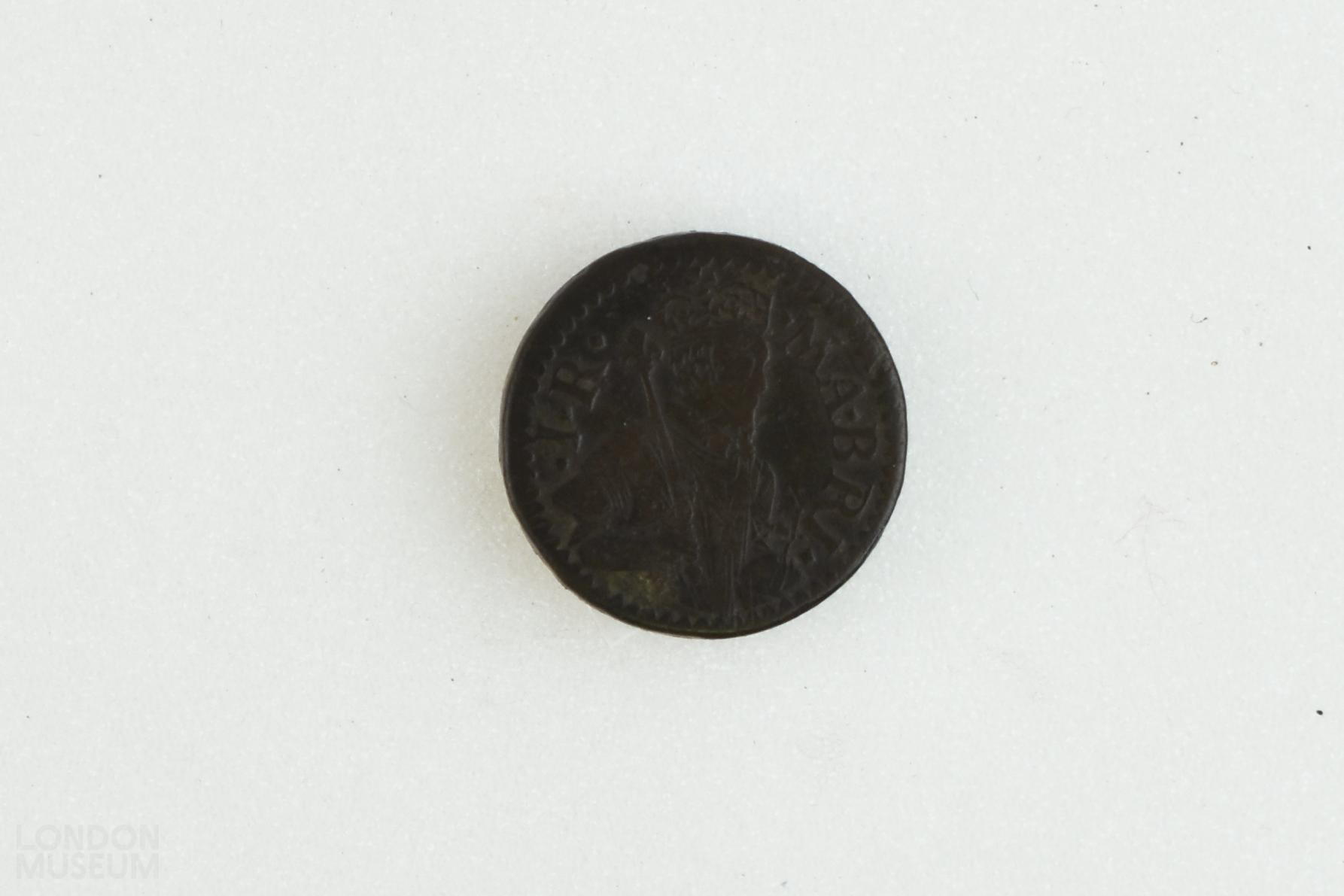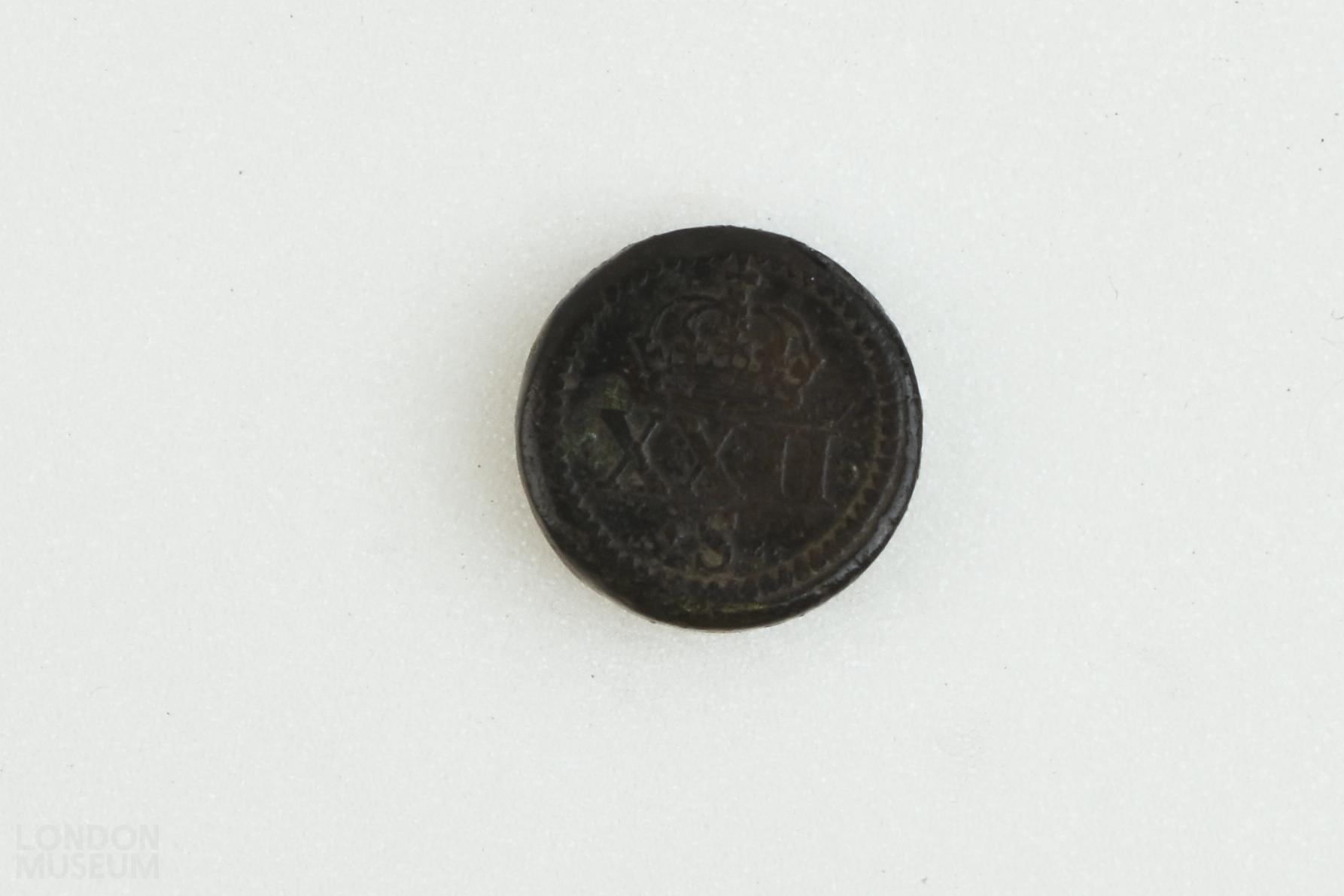Circular 22/ coin weight of James I. The obverse is stamped with the top half of James facing right holding an orb and sceptre. The legend reads 'IR MABRI'. The reverse is stamped with a two arched crown above 'XXII S'.