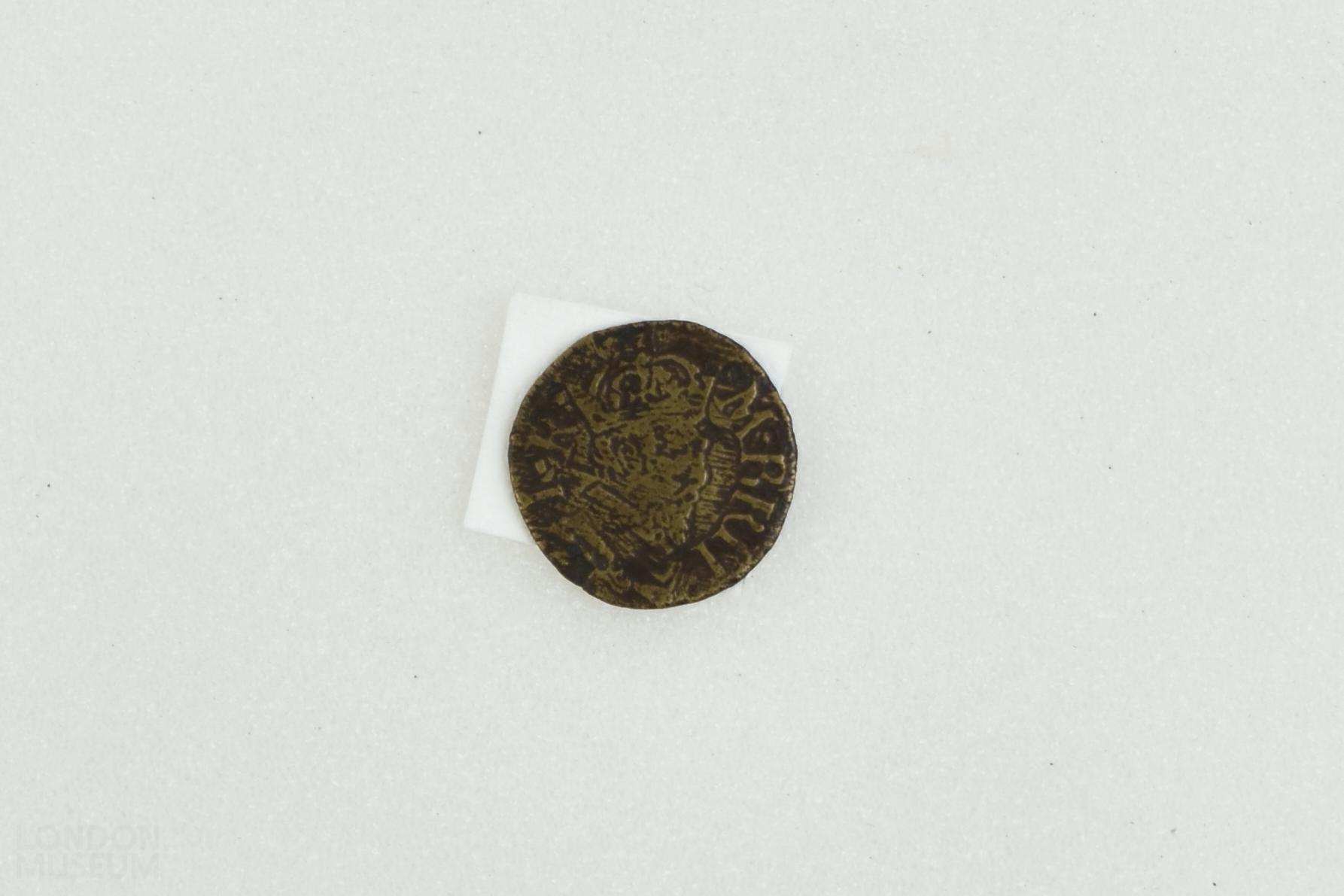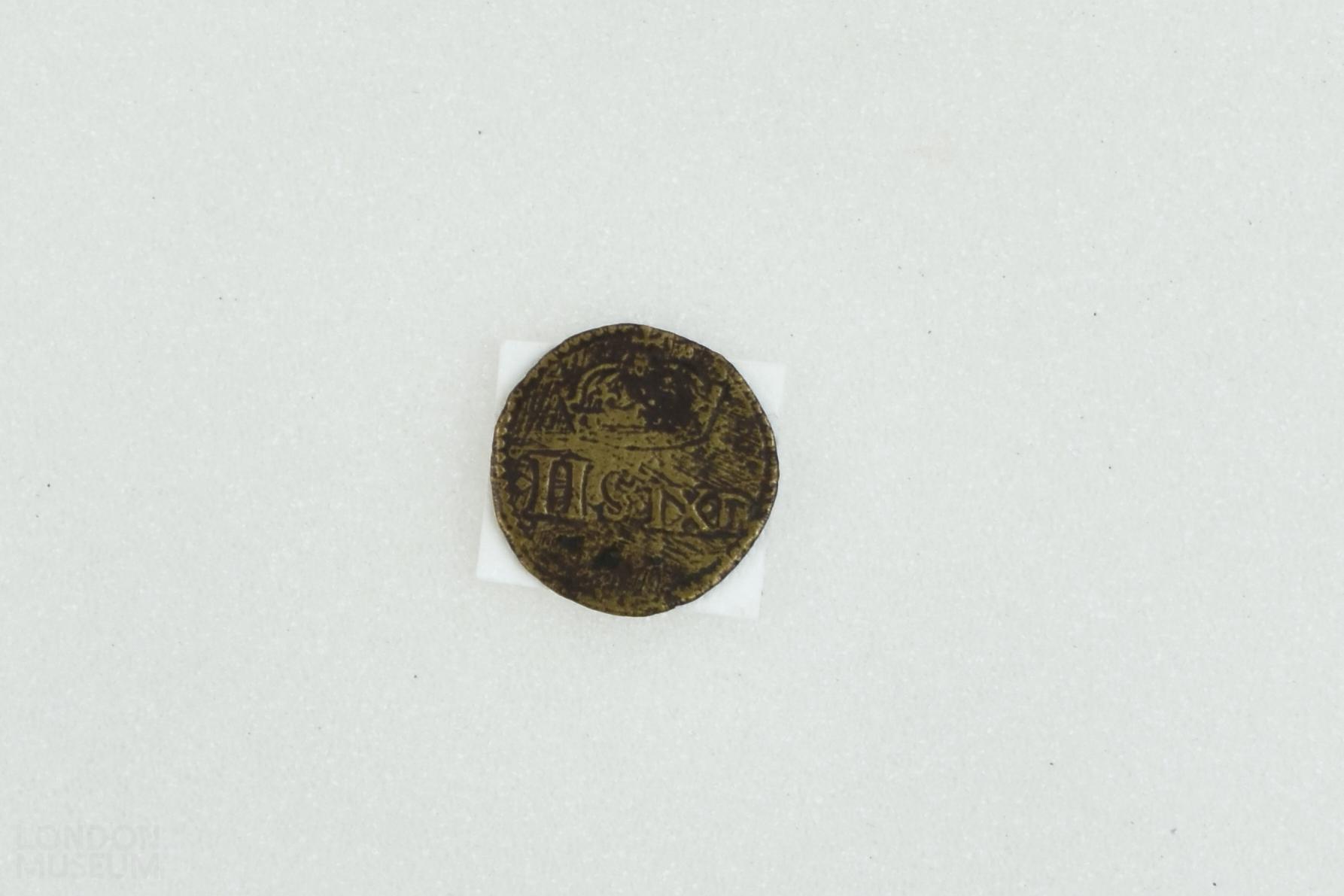 Circular coin weight of James I. The obverse is stamped with the head of James facing right with the legend 'IR MBRIT'. The reverse is stamped with a two arched crown above 'II S IXT'.