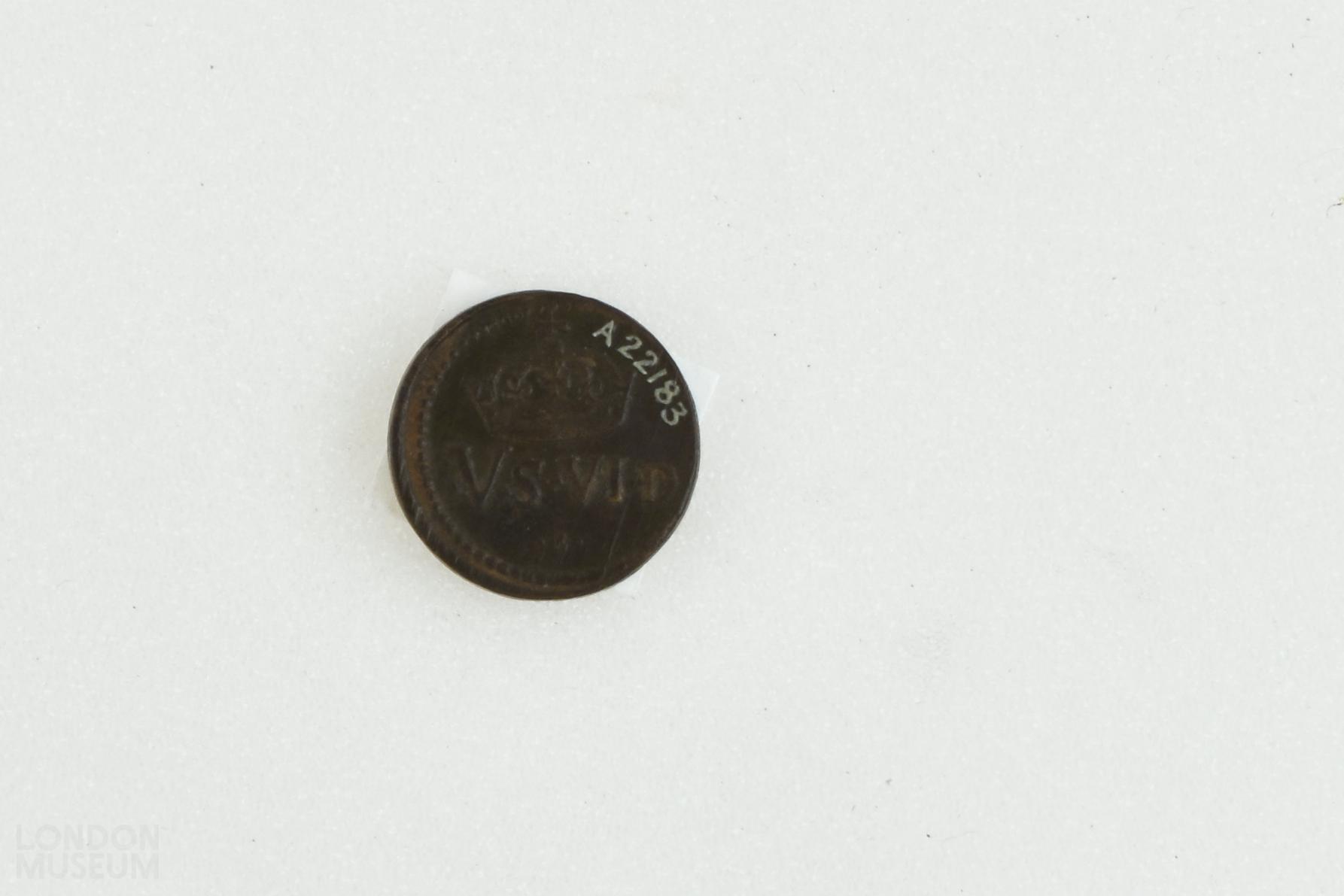 Circular coin weight for a James I 6/6. The obverse is stamped with the angel St Michael standing triumphant over the dragon. The legend reads "I R M B REX'. The reverse is stamped with a two arched crown above 'V.S.VI.D'.