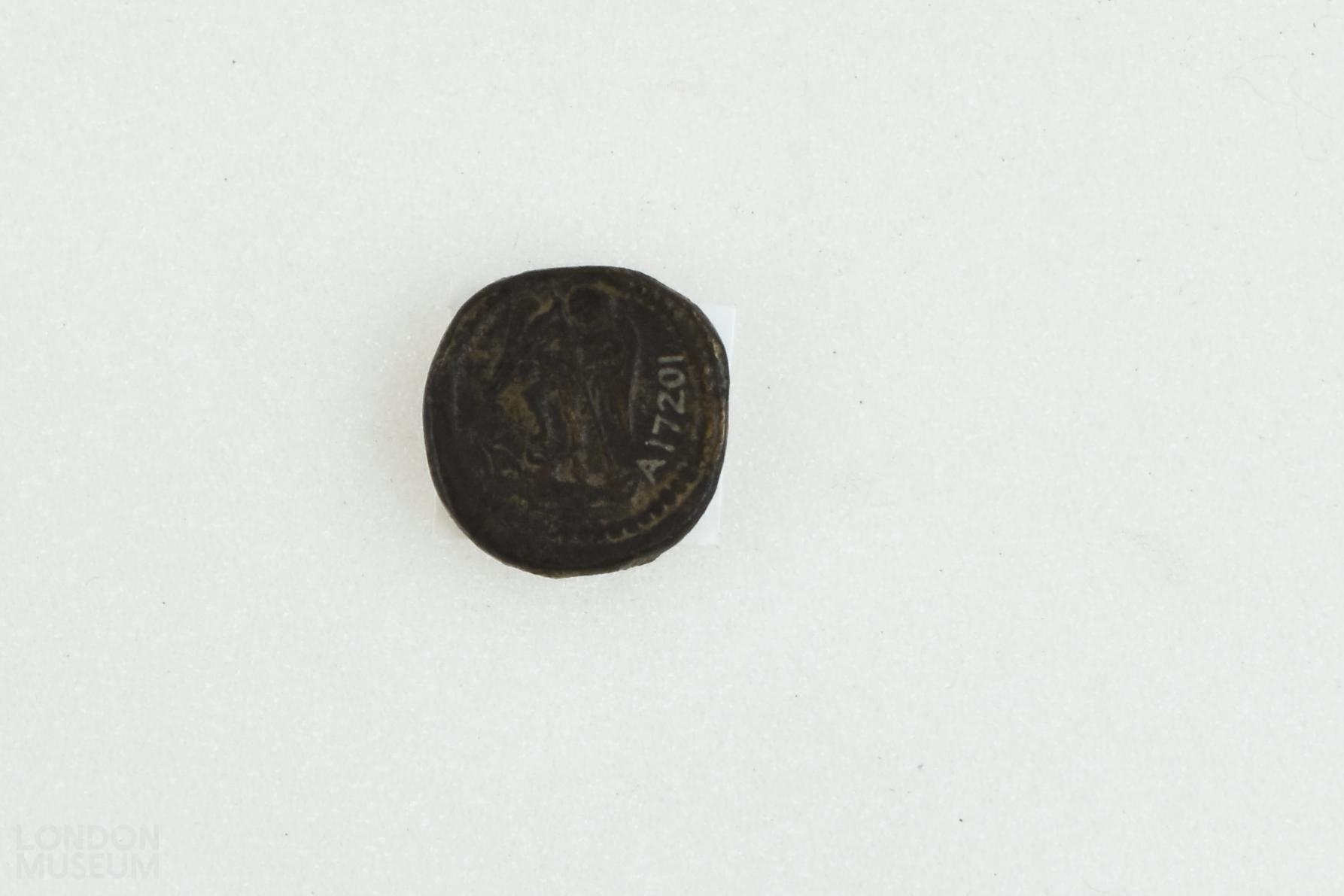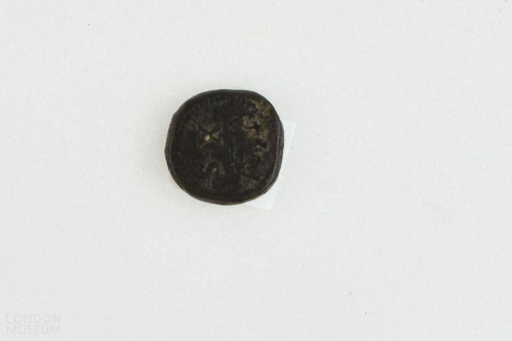 Circular 10/- coin weight. The obverse is stamped with the angel Michael standing triumphant over a serpent. The reverse is stamped with an open crown above 'X S'.