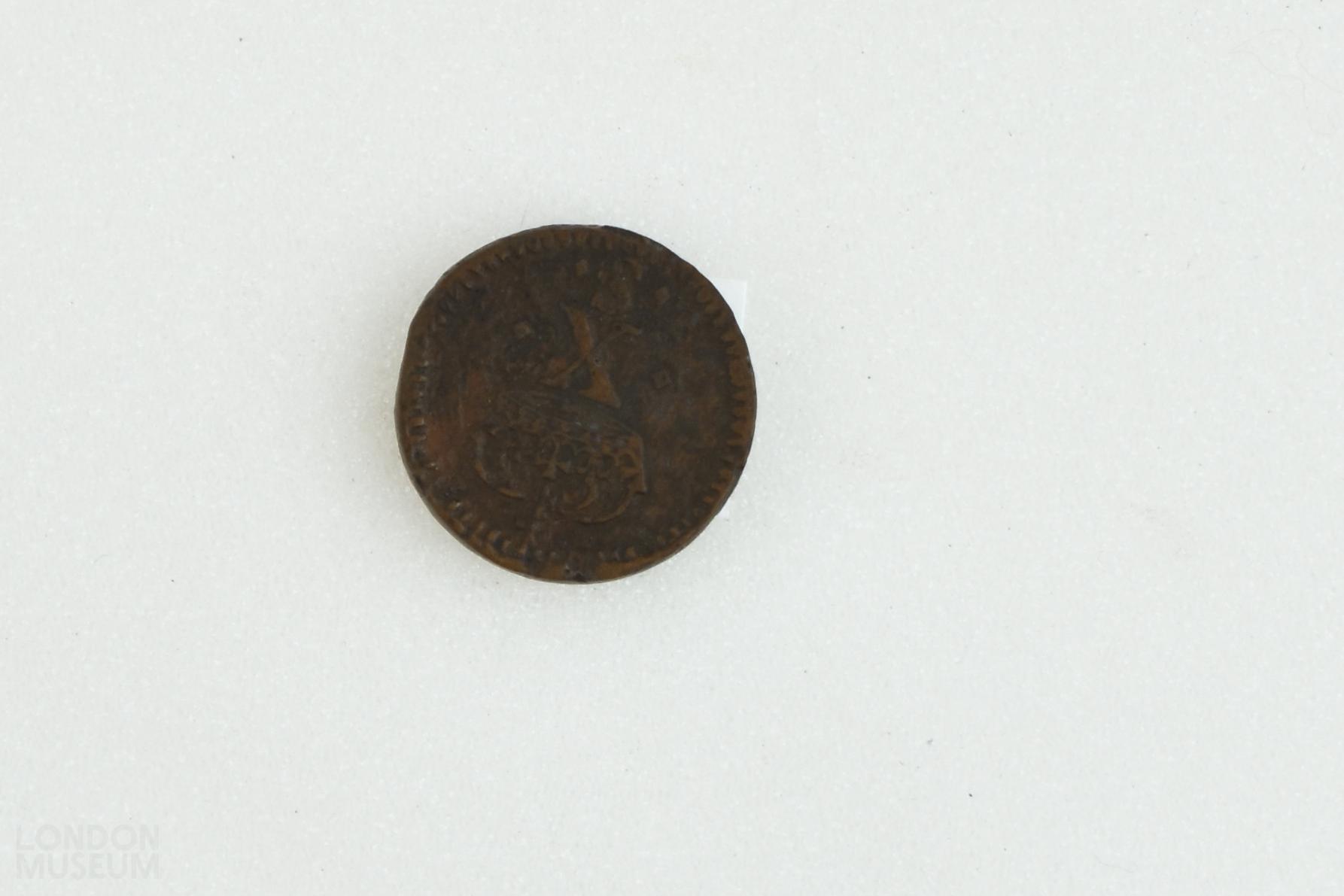 Circular 10/- coin weight of Charles I. The obverse is stamped with a damaged head of Charles facing left with the legend 'CAROLVS REX'. The reverse is stamped with a two arched crown above 'X S'.