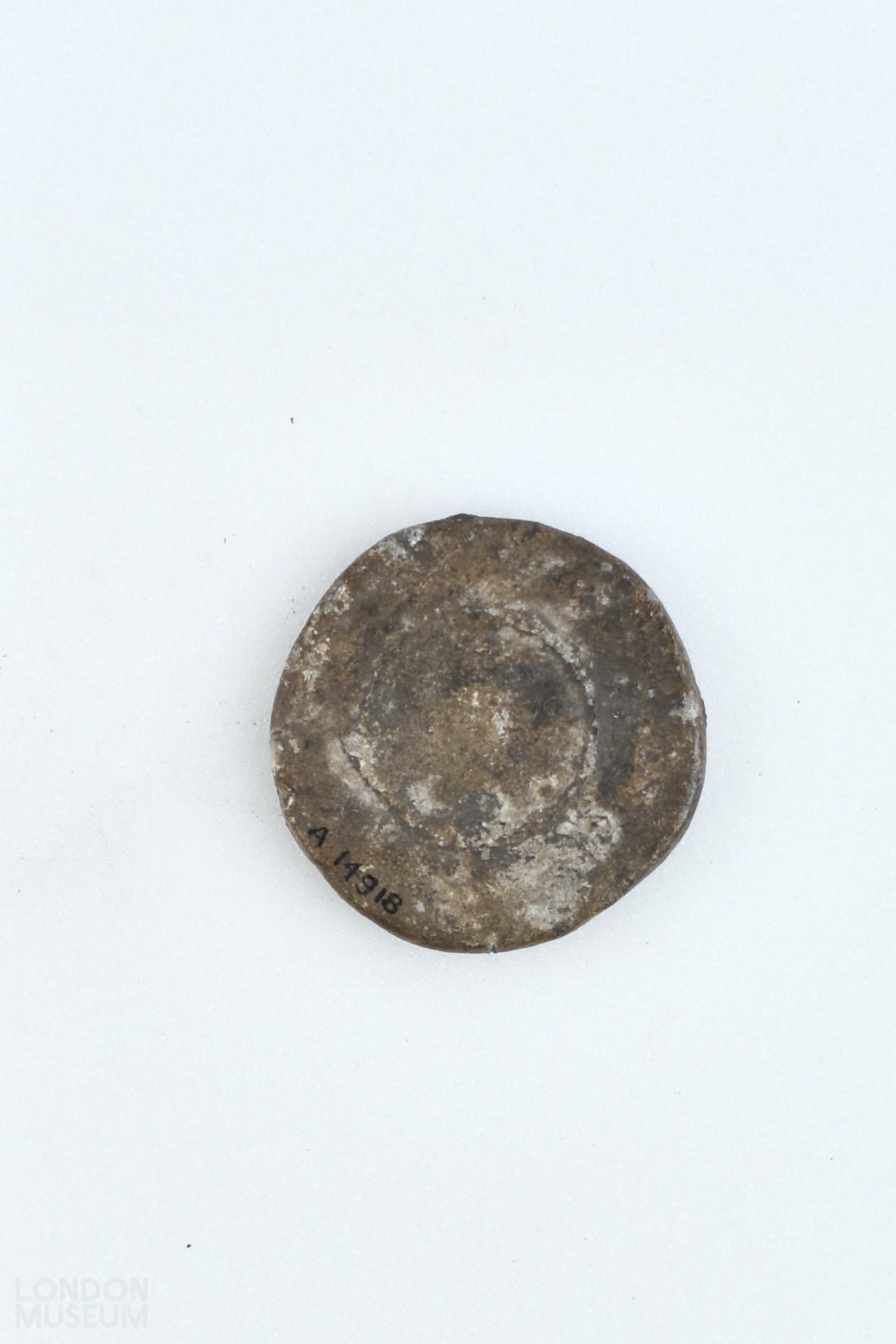 Lead alloy disc weight. With a raised ring in the centre. There are no marks.