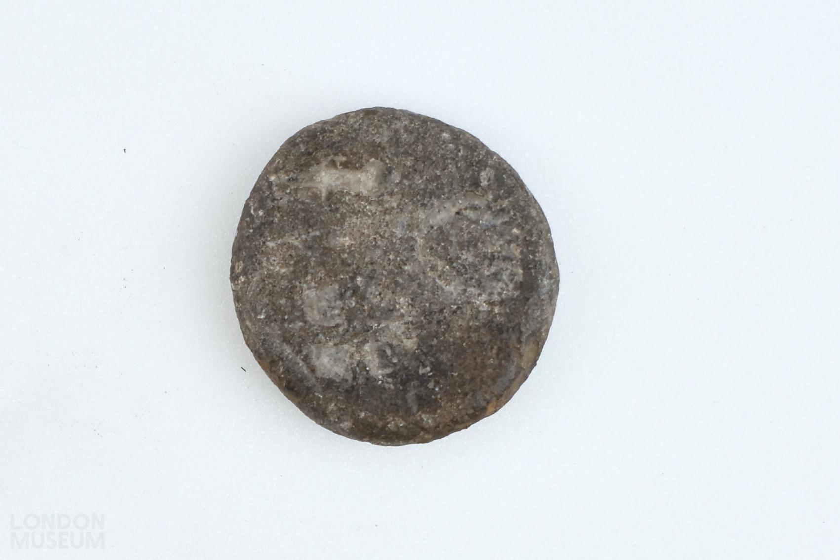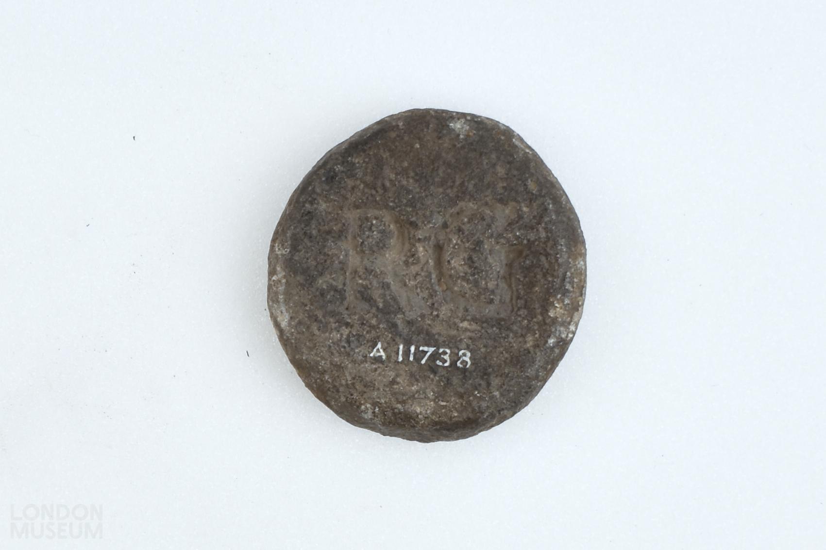 Lead alloy disc weight with the letters ‘RG’ on one side. The other side has three marks: a sword for the City of London, a quartered shield for the City of London and a third indistinct mark.