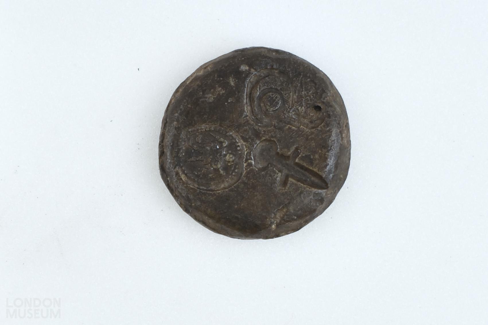 A 1/4 lb lead alloy weight bearing three marks: a dagger for the City of London, an angel with scales for the Plumbers' Company which is post 1611 and either a crown within a semi-circle or a ship with an anchor.