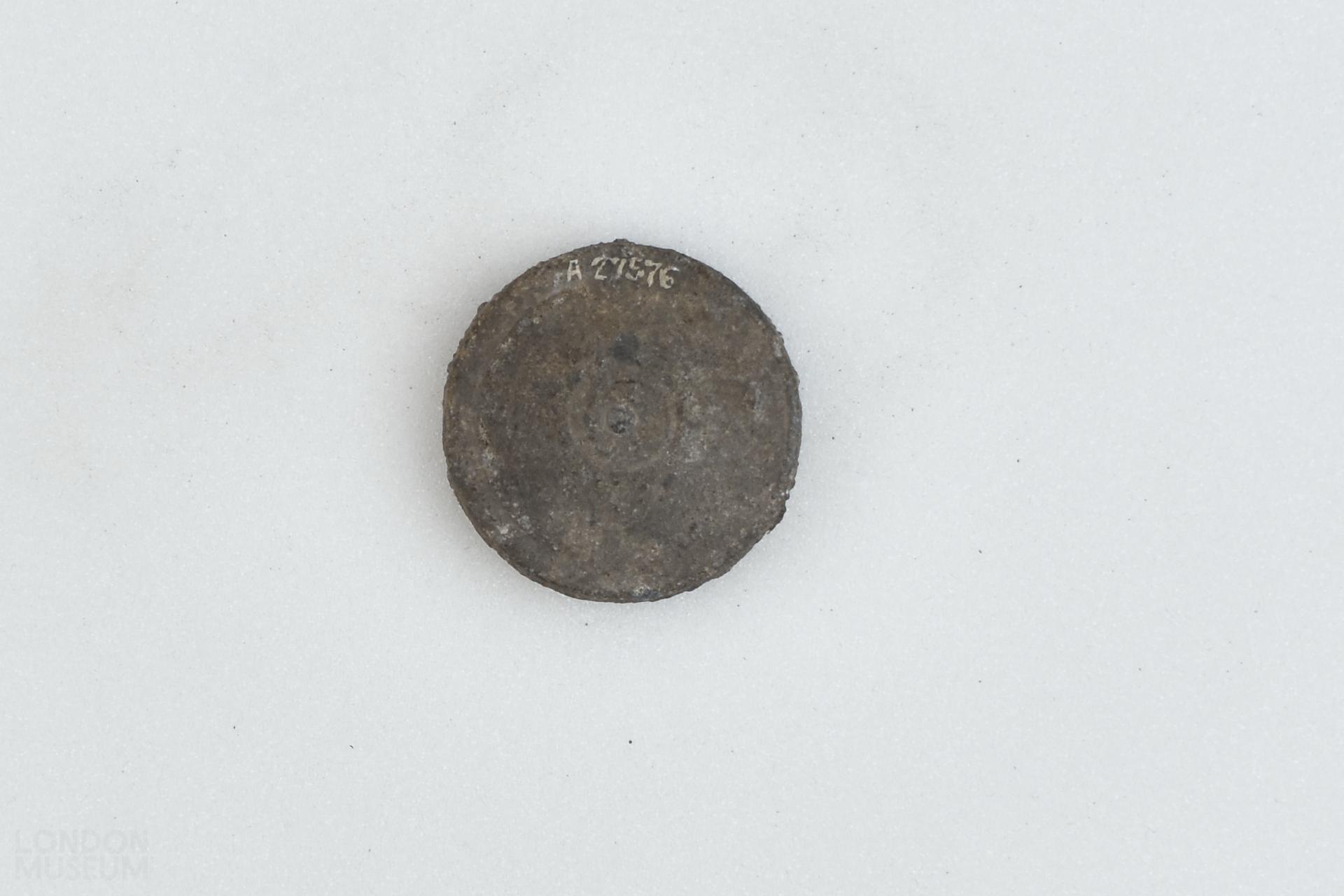 Circular lead disc weight with an indented ring near the centre and one near the edge. There is a central nipple. There are no marks.
