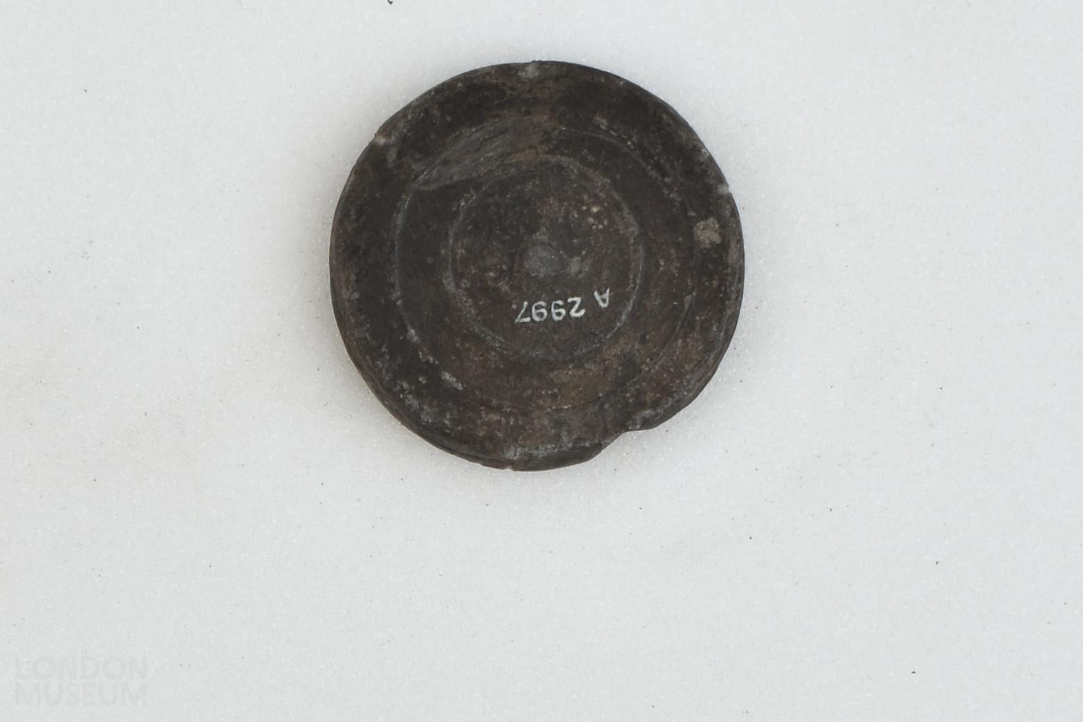 Circular lead disc weight with a slightly raised edge and two raised concentric circles. There is a central nipple. No marks.