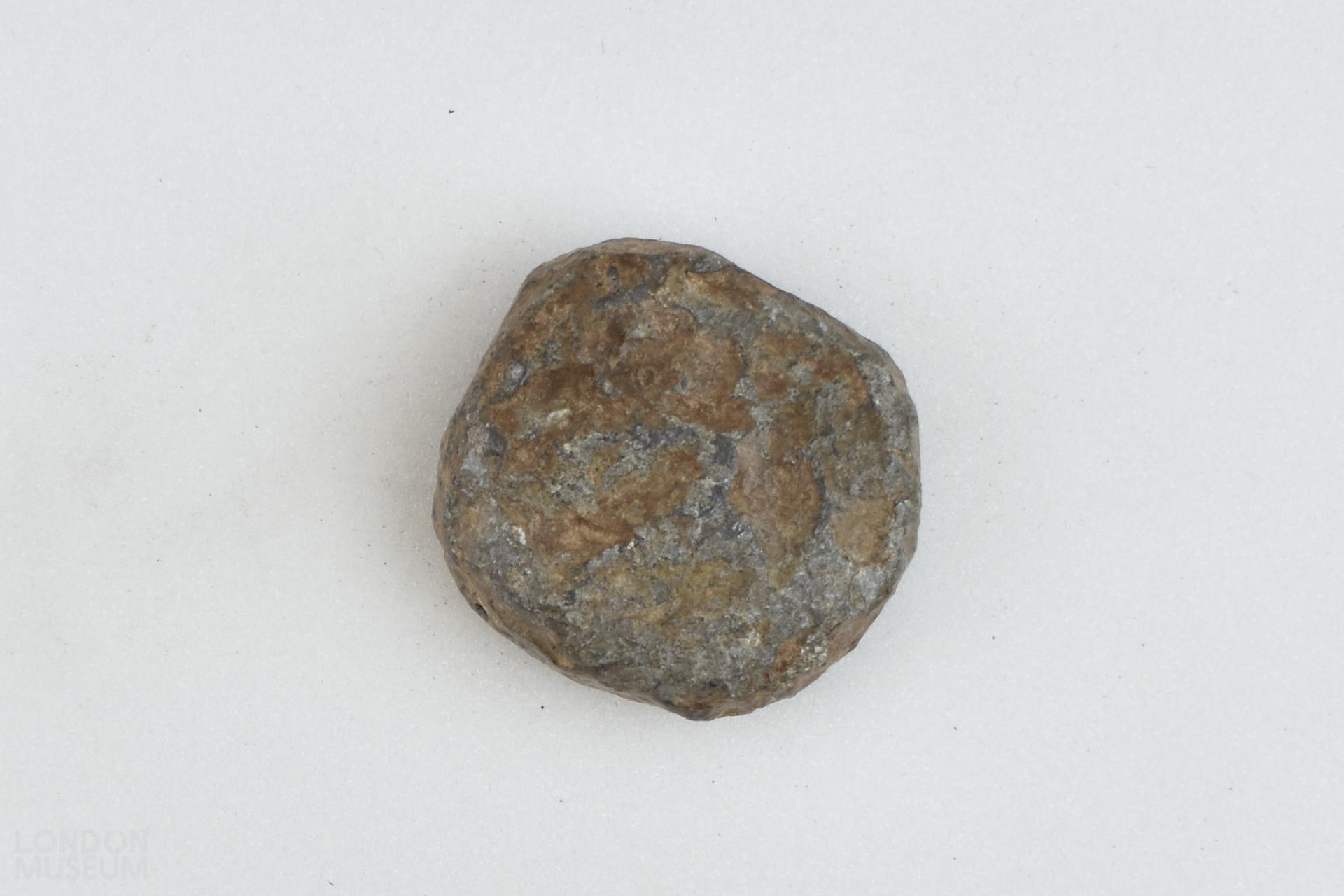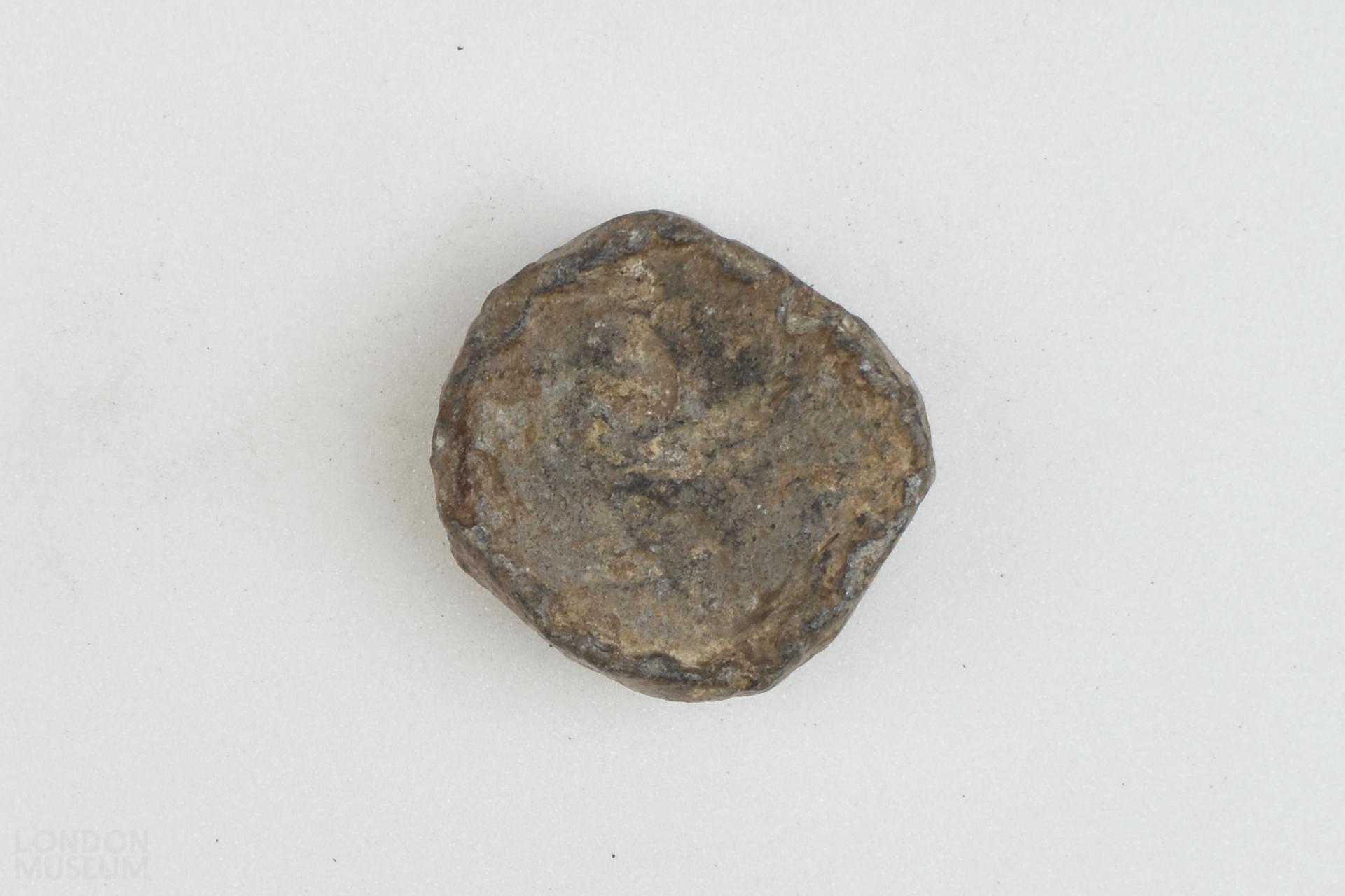 Circular lead disc weight with a raised edge. The surface is uneven and is stamped with a fleur de lys. The other face also has a mark but this is indistinct.