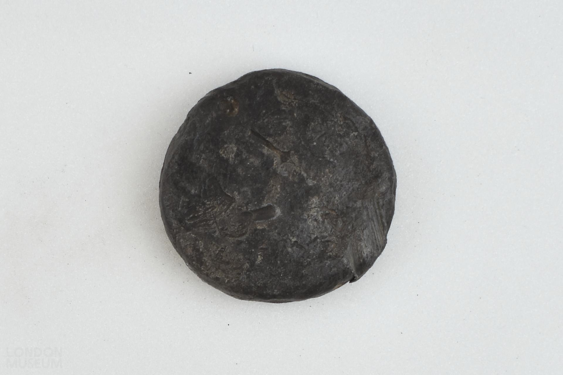 Circular lead disc. It has three marks: a crowned C for either Charles I or Charles II, a sword (the sword of St Paul, patron saint of the City of London) and a ewer for the Founders' Company.