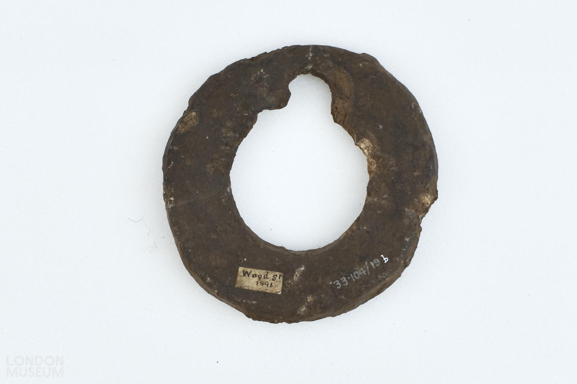 A circular ring-like object with a hole at the centre, presumably a type of weight. Central hole circular with a protrusion on one side. Chipped and misshapen.