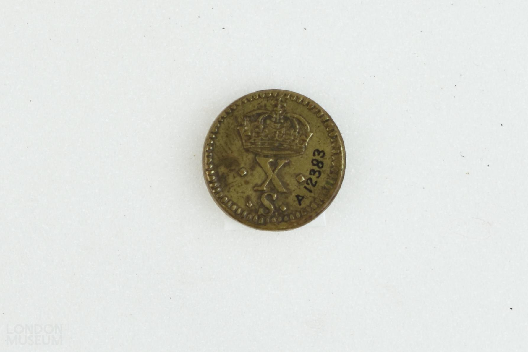 Circular 10/- coin weight of Charles I. The obverse is stamped with the head of Charles l, and CAROLVS REX. The reverse is stamped with a two arched crown above X S.