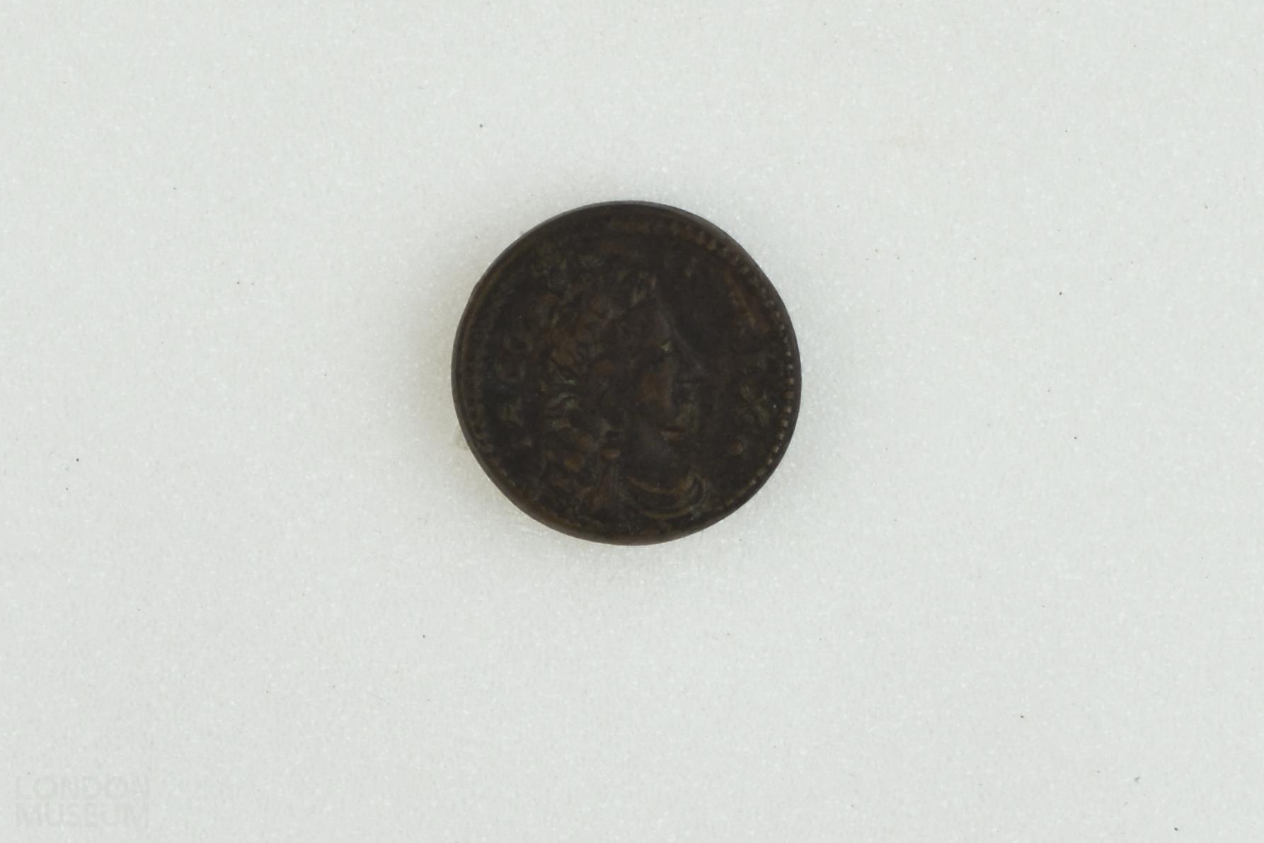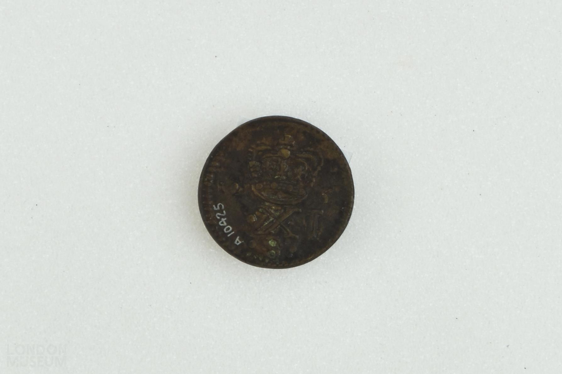 Circular 11/- coin weight of James II. The obverse is stamped with the head of James facing right with an indistinct legend. The reverse is stamped with a two arched jewelled crown above 'XI S'.