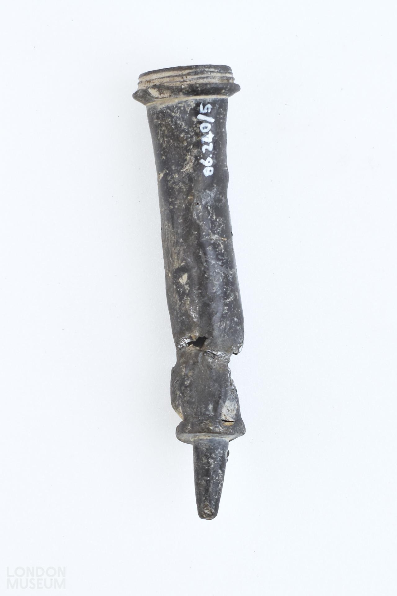 Lead alloy syringe with damaged and split barrel. The screw lid and plunger are missing. The barrel and head were cast separately soldered together and then turned.