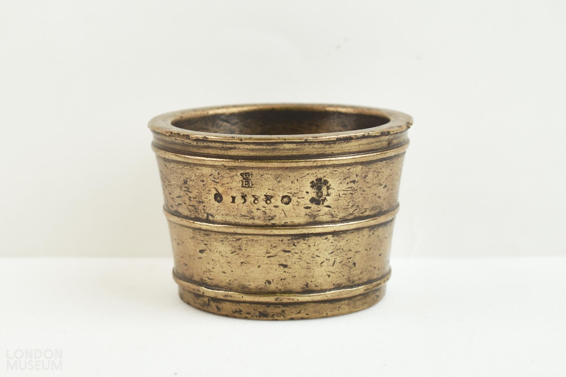 Cast copper alloy cup weight. A straight sided vessel that flares out at the mouth. There are three ribs around the outer side. The outside is stamped with 1588 between two Tudor roses. Above this is a crowned EL and beside this there is a circular inscription that reads 'SOME REST CO'. The inside base is stamped with a capital L and a crowned? leopard that is worn.
