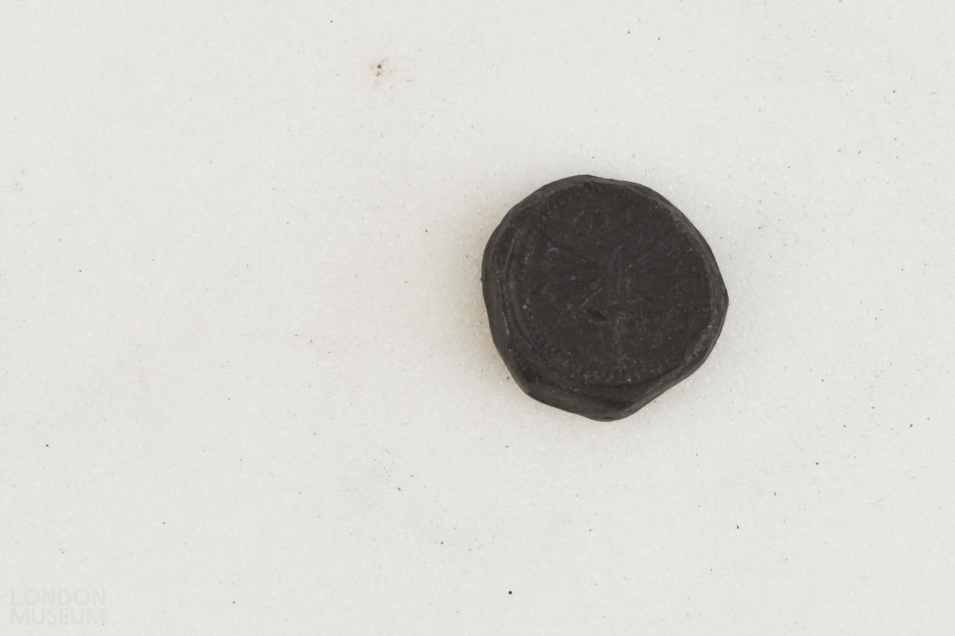 Roughly circular lead disc weight. Top face stamped with 6 arrows tied together with a cord, possibly the symbol of one of the Dutch provinces.