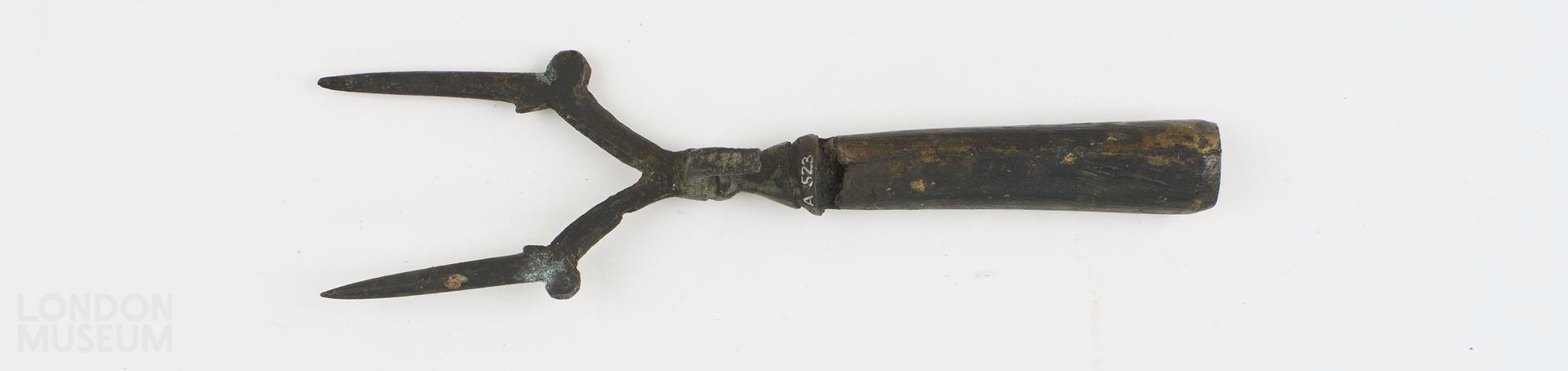 Copper alloy server's fork with 2 angular prongs with knobs on outside of angles, and small hook at right angles to prongs and facing away from them; tanged with collar surviving but handle gone.
