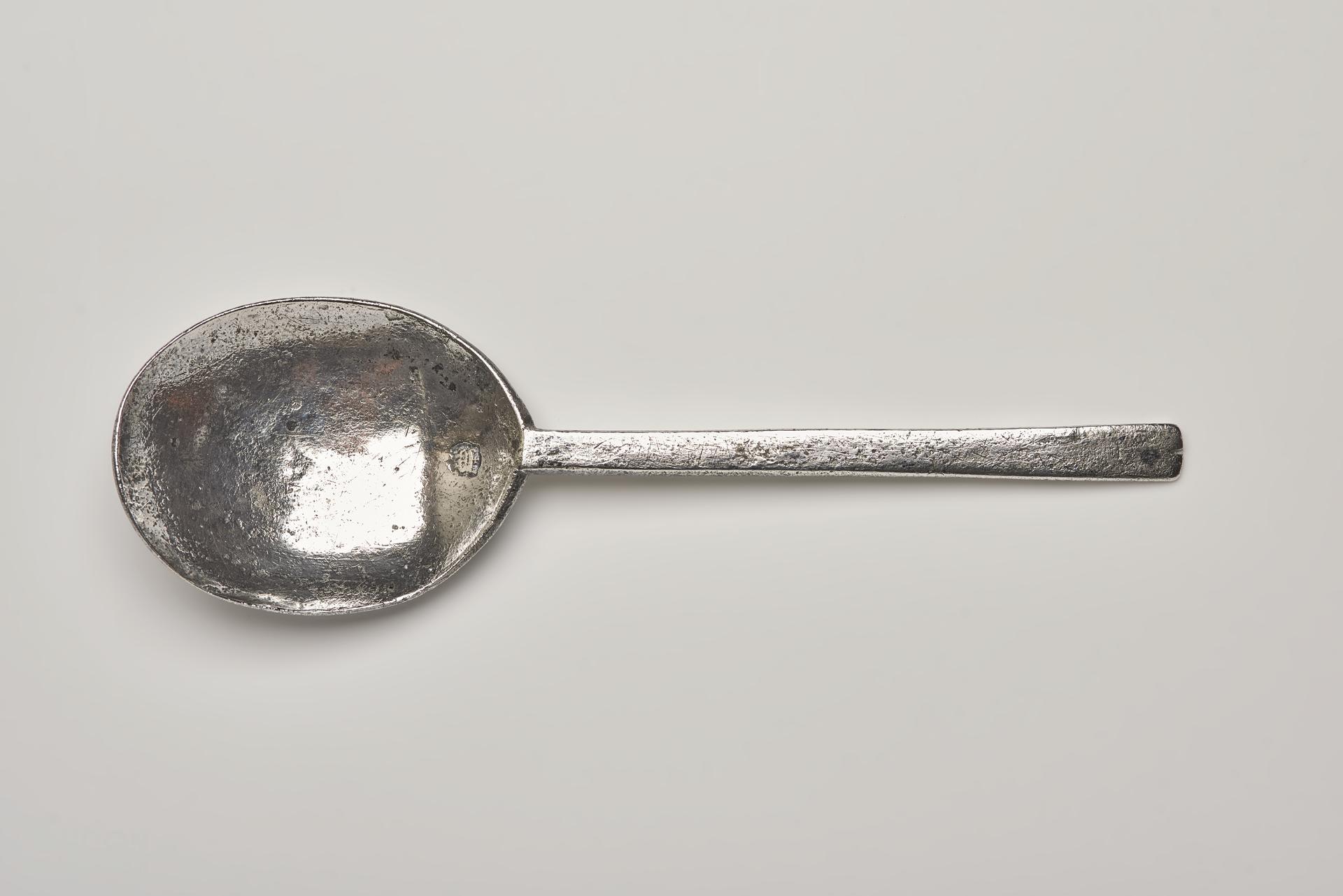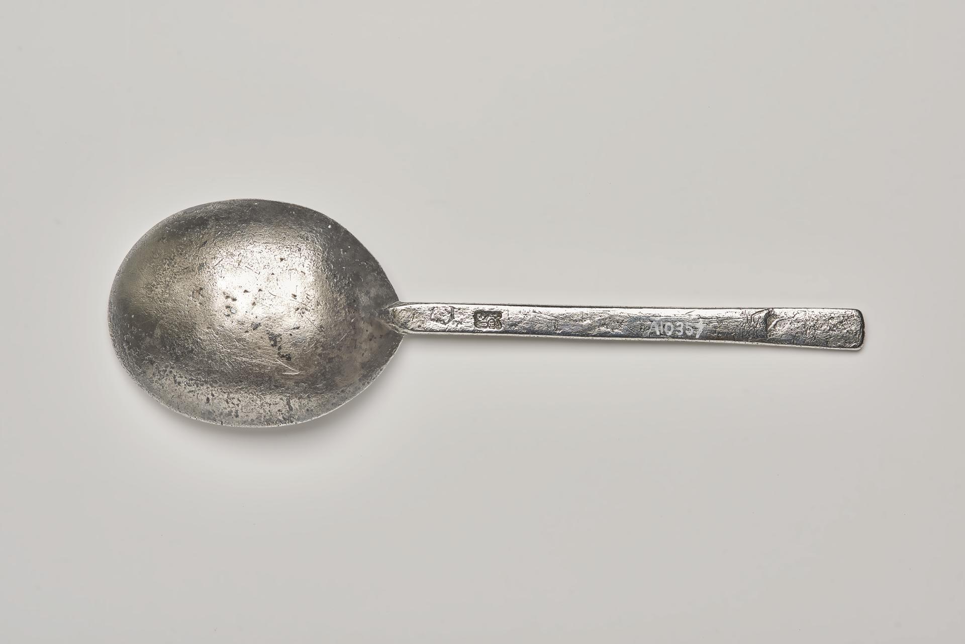 A silver spoon with oval bowl, flattened stem which increases in width from the bowl to the tip, with 'Puritan type' straight-edged terminal with vertical nicks or notches on the upper face. There is a crowned leopard's head hallmark in the bowl and on the back of the stem three indistinct marks; one with the lion passant, another with the date letter (possibly for 1651).