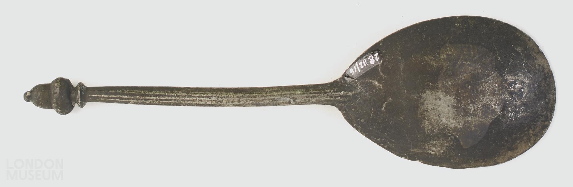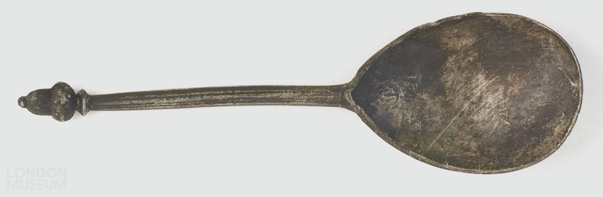 A pewter spoon with acorn knop. Dated to 16th century.