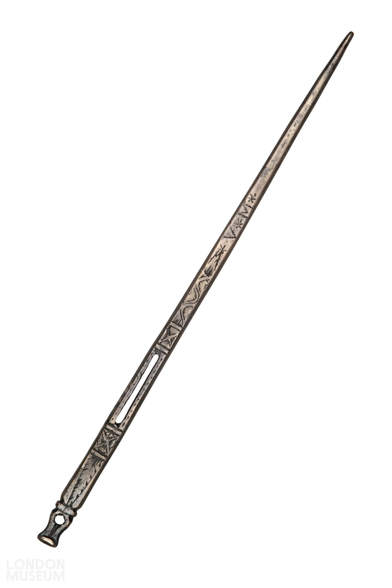 Bodkins of this type made from precious and base metals, were a necessary item of equipment for both men and women and were used for threading and rethreading ribbons, cords, laces and drawstrings. Many were carried about the person in a small case for general use and emergency repairs. They were frequently chased and engraved with simple designs, sometimes incorporating the owner's initials, and often terminated in an ear-spoon or snuff-spoon. Silver bodkins were made by specialist small-ware silversmiths and were commonly retailed by petty-chapmen and other itinerant salesmen of fancy goods. Some seem to have been exchanged as a bethrothal or New Year's gift. According to William Harrison (1570), 'Women's maskes, Buskes, Mufs, Fanns, Perewigs and Bodkins were first devised and used in Italy by Curtezans, and from thence brought into France and there received of the best sort for gallant ornaments, & from the thence they came into England. (f96/[19]). Bodkins were also worn in the hair or tucked behind the ear, the head decorated with a perforation from which a precious stone, bead, or pearl was attached. As a dress accessory they appear in Dutch records from the 17th century and the 'hoofdnaald' often occurs in combination with the 'diadem cap' hairpiece and was particularly fashionable between 1610 and 1630. According to Jan Baart's Opgravigen in Amsterdam, 1976, 'the 'hoofdnaald' is worn on the left as well as the right of the forehead' and continued to be used in regional and peasant dress until the 20th century - its position on the forehead used to denote marital status, viz., left for spinsters and right for married women.