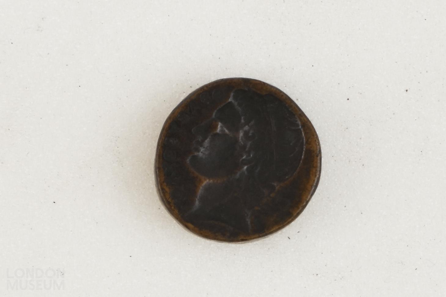 Circular copper alloy weight. Cast. Top face bears male head in profile, with legend in the Greek alphabet?. Edge and reverse plain.