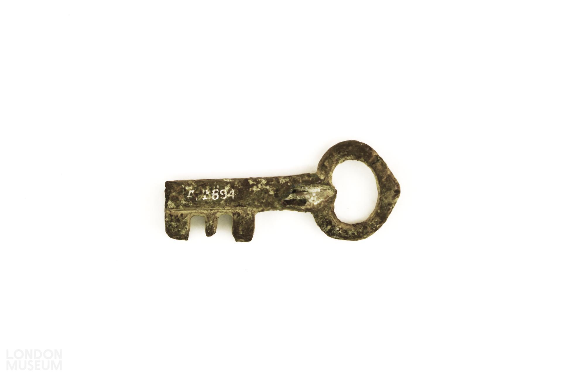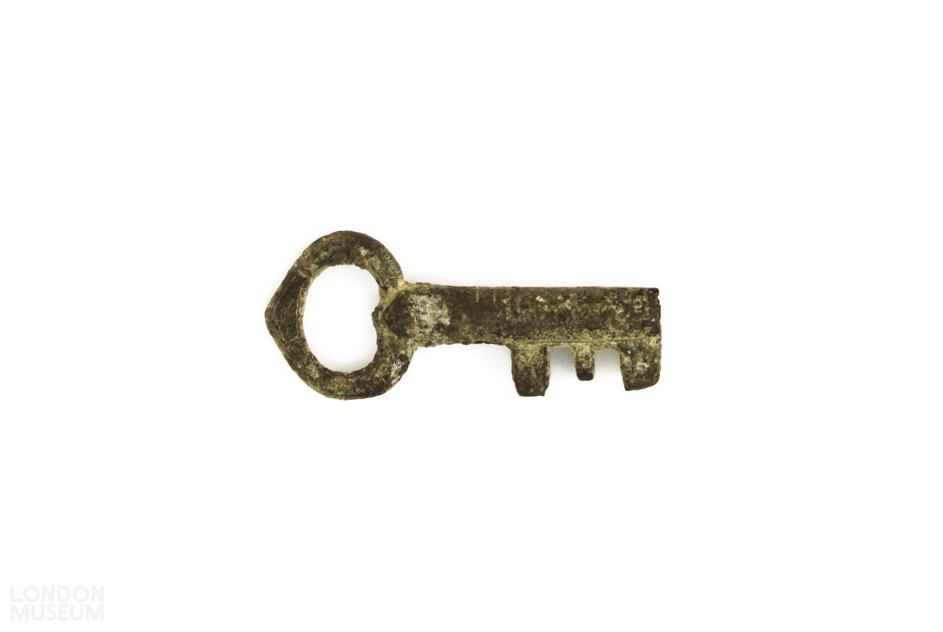 Iron key. An oval bow. The stem is piped and circular in section. A small section of the stem at the top is missing. The bit consists of 3 separate forked teeth.