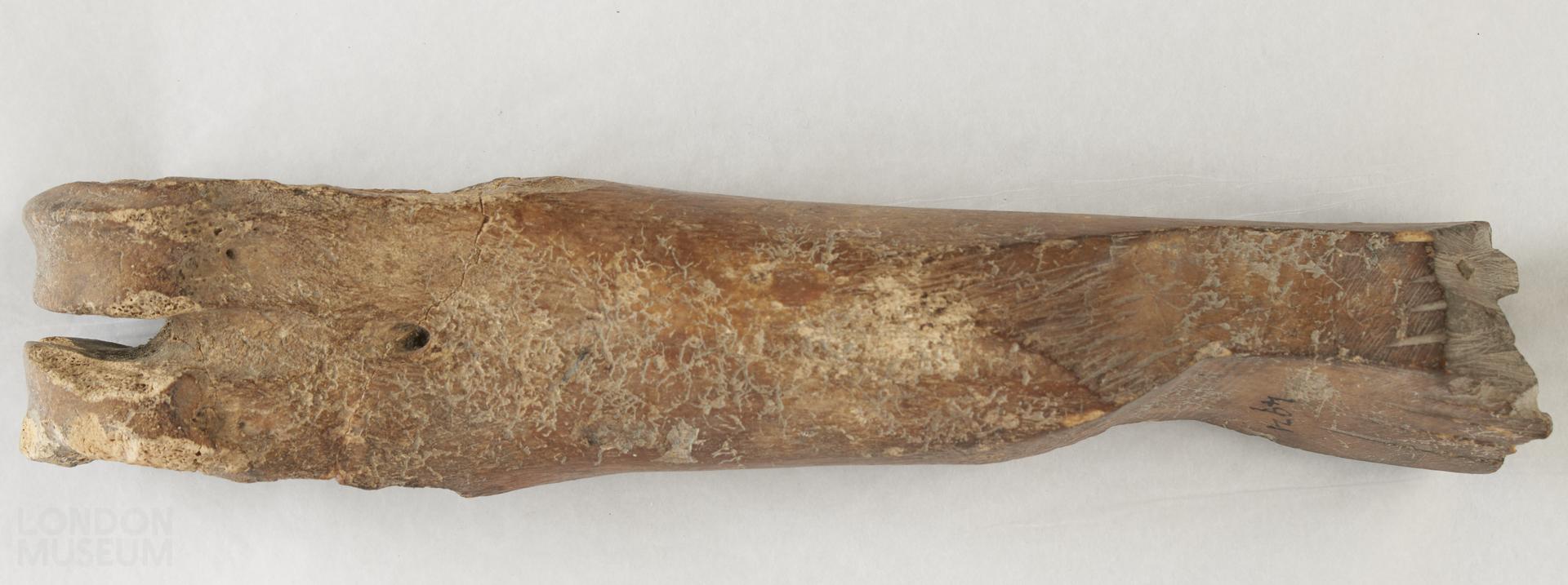 Pinner's bone. Bovine metatarsal, right side, fused. The lateral and medial sides at the distal end have been sawn off. The bone has broken in the joint above the foramen. There are facets cut in to the shaft at the proximal end with eleven grooves cut into the longitudinal axis. There are file marks on every side. The bone marrow cavity has been enlarged at the proximal end; and there are file marks around the circumference.