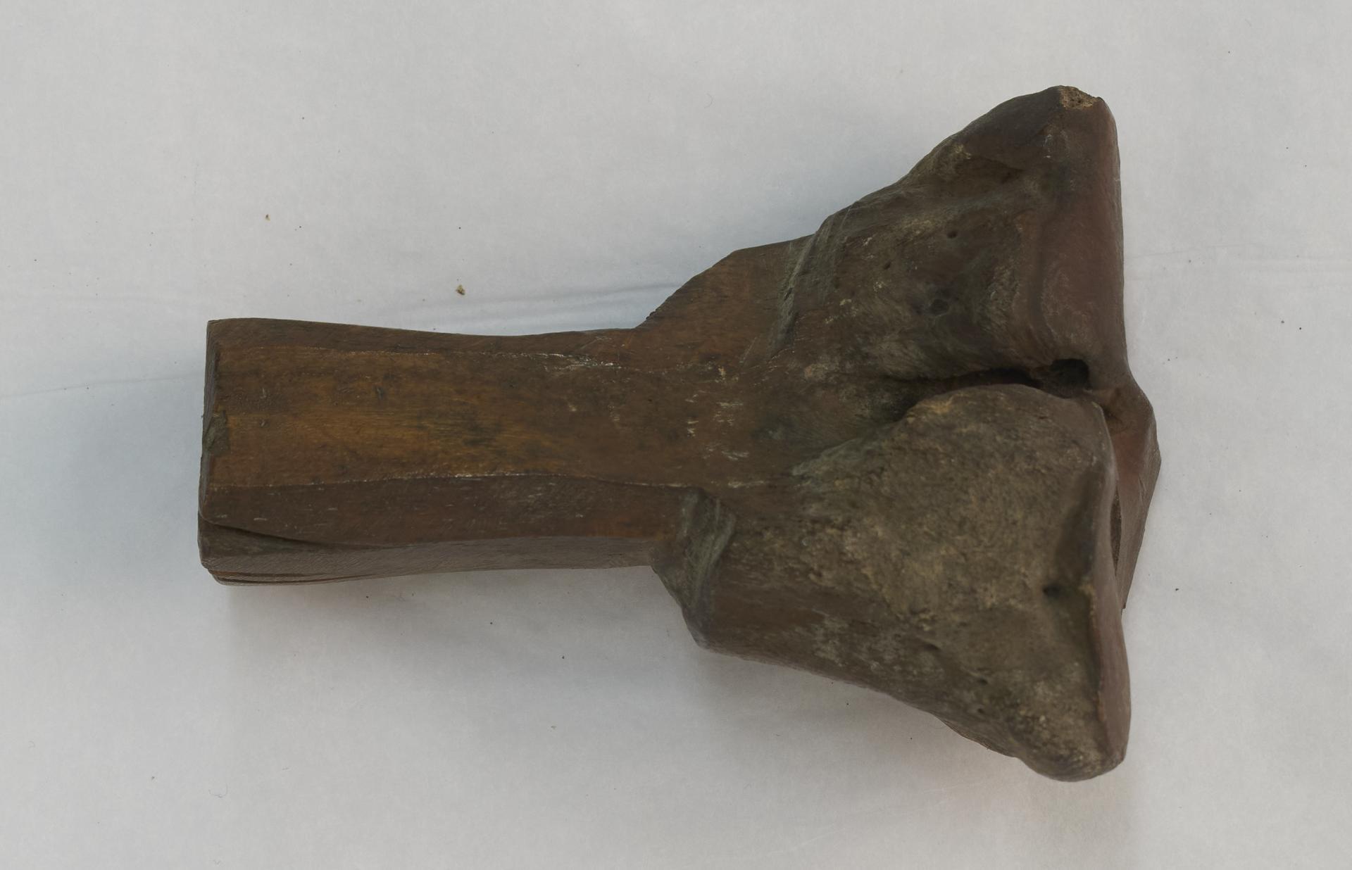 Pinner's bone. Bovine metacarpal, left-hand, proximal end. The shaft towards the distal end has five facets, with six deep grooves cut into the anterior, medial and lateral surfaces on the longitudinal axis by a saw. There are file marks on every side. The holes at the proximal and distal ends have been enlarged.