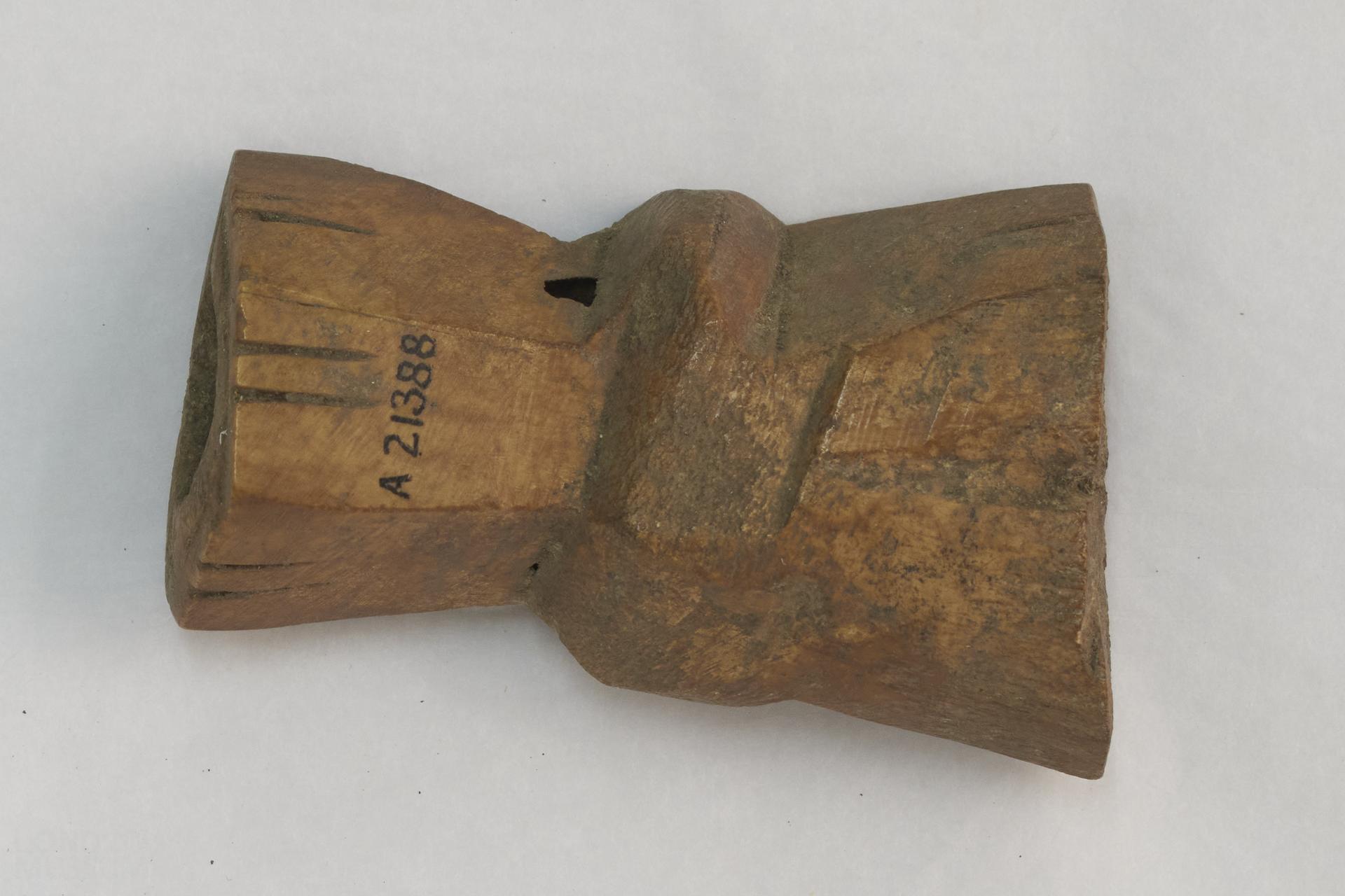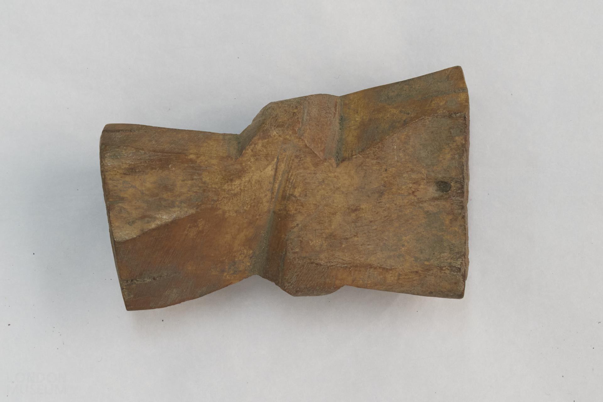 Pinner's bone, Bovine/horse(?) metacarpal(?) left side. Proximal end. The bone has many faceted surfaces. There are six towards the distal end of the shaft with ten deep grooves cut into the longitudinal axis by a saw. The medial (?) side has worn through. There are file marks on all sides. The holes at the proximal and distal ends have been enlarged.