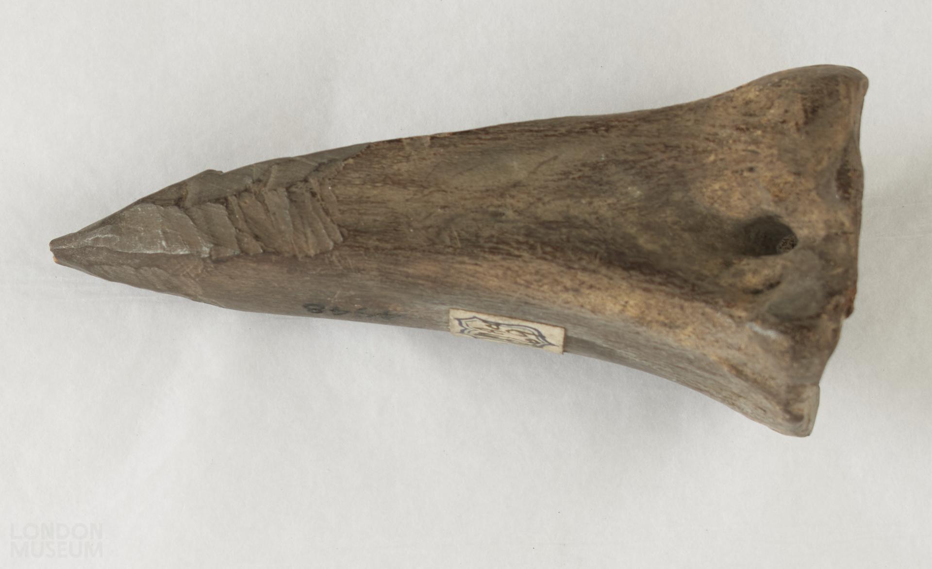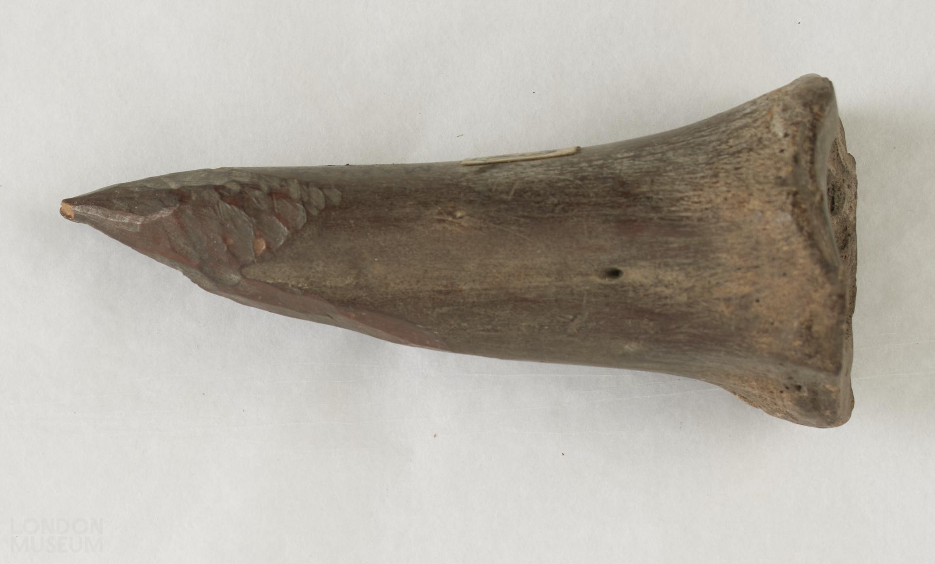 Bone piercer. Bovine metatarsus, left side. Proximal end of the mid-shaft. The mid-shaft towards the distal end has been made into a point on the medial surface. The hole at the proximal end has been enlarged.